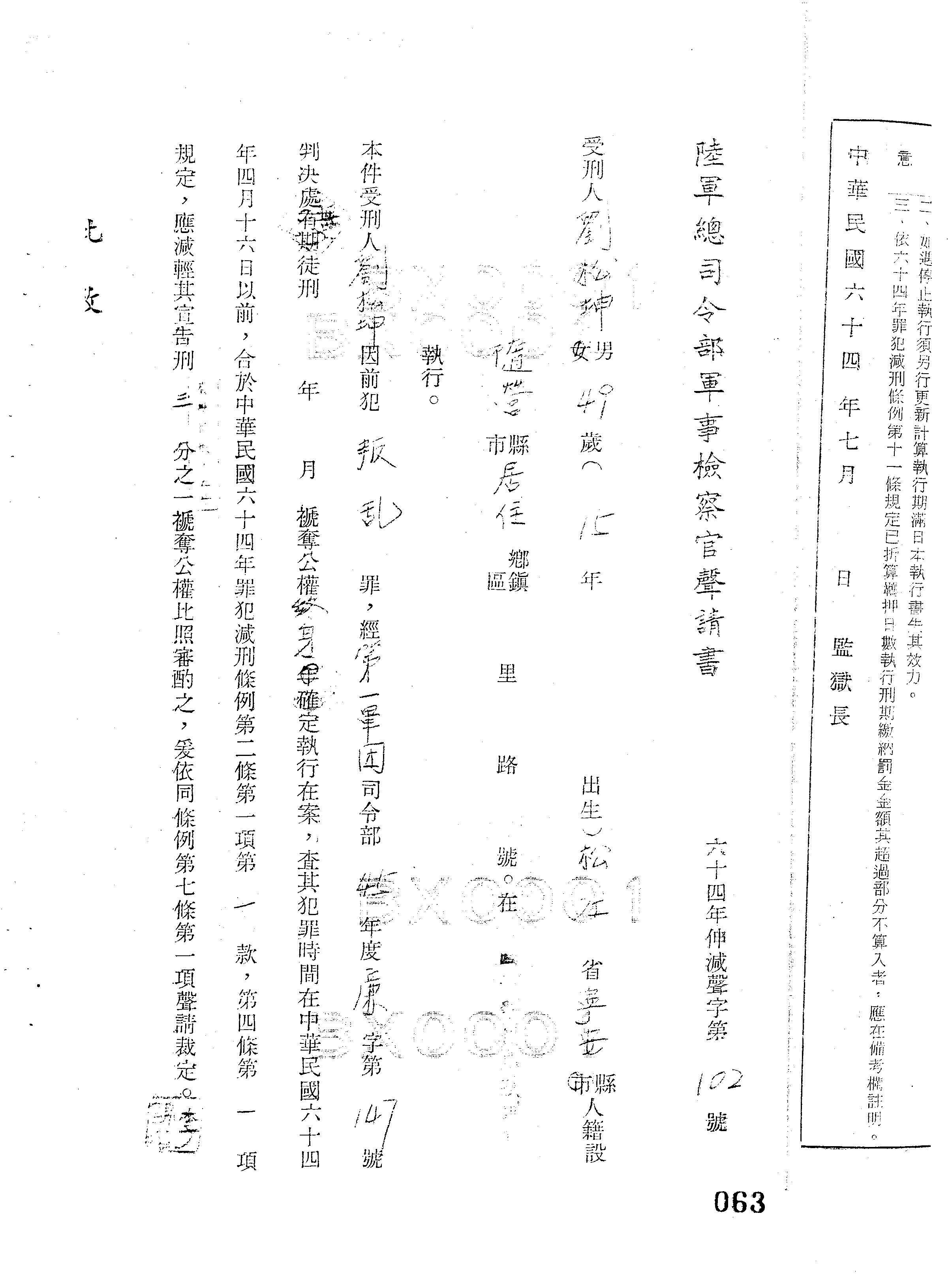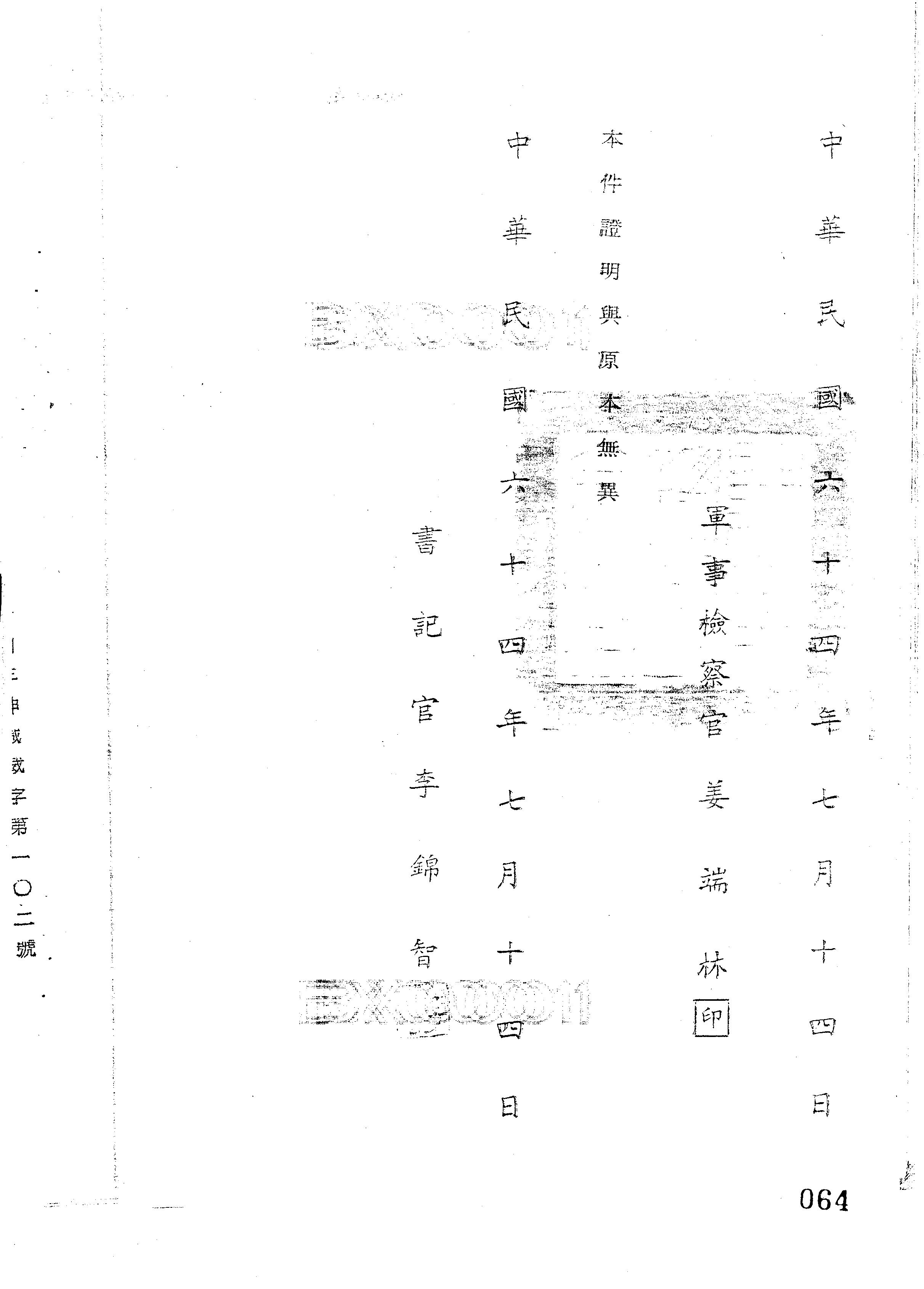 陸軍總司令部64年伸減聲字第0102號軍事檢察官聲請書