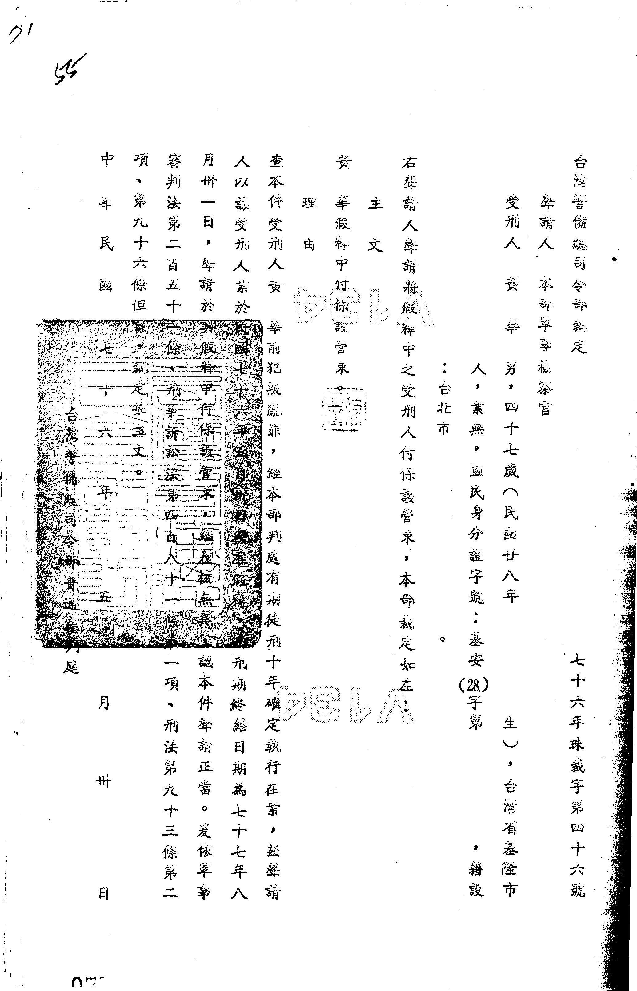 臺灣警備總司令部76年珠裁字第0046號裁定書