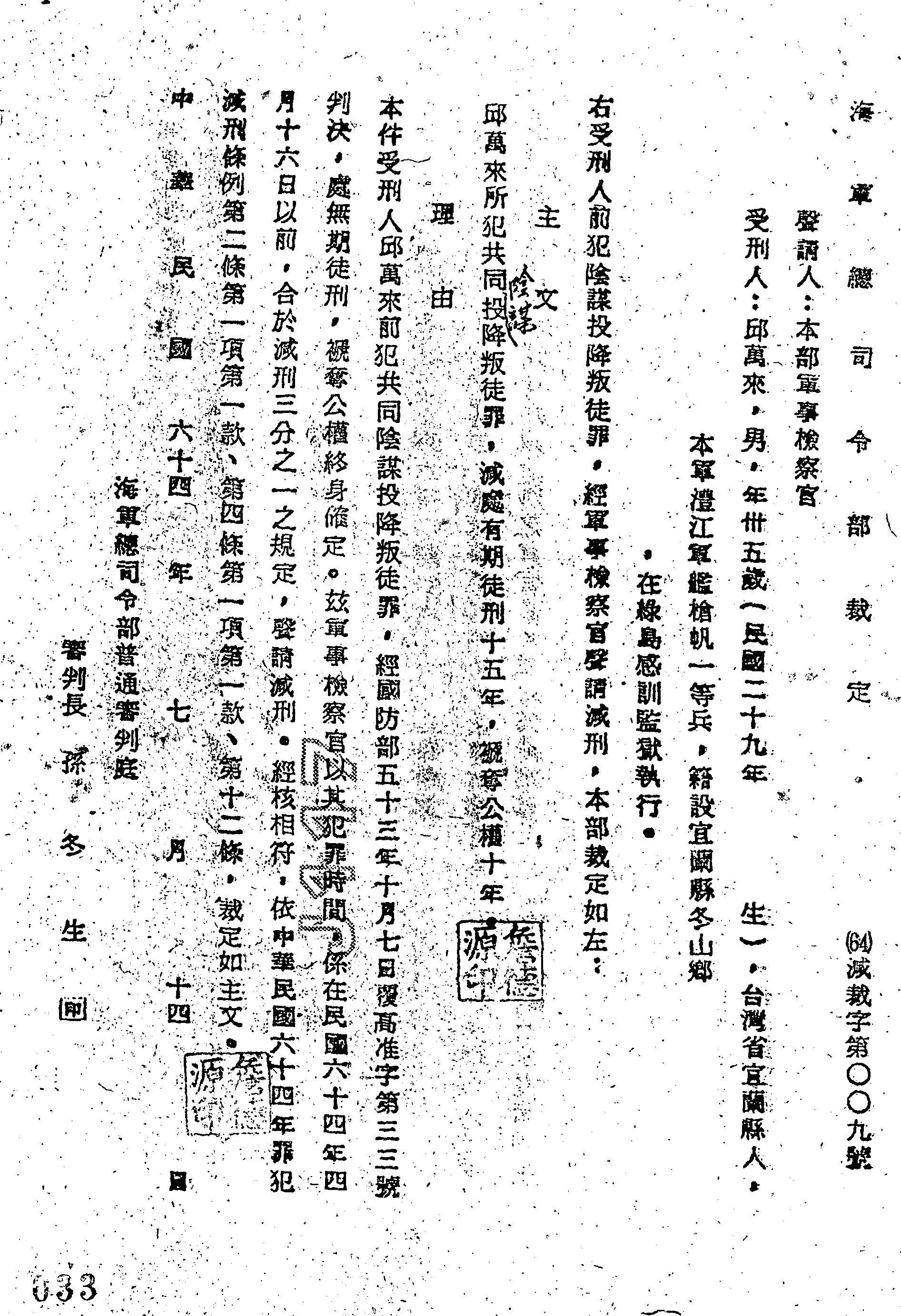 裁判書主文/要旨:邱萬來所犯「共同陰謀投降叛徒罪」,減處有期徒刑15年,褫奪公權10年。