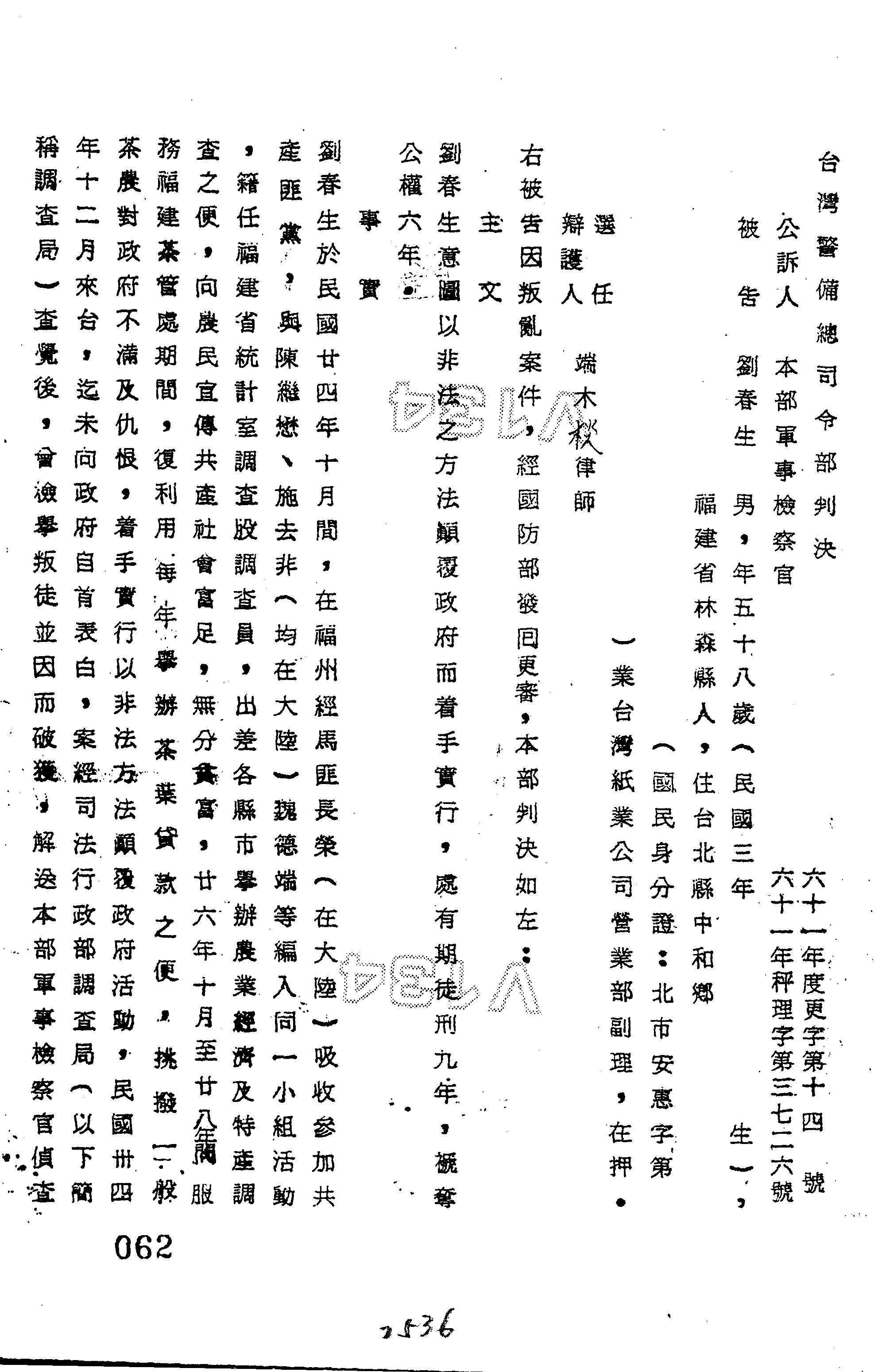 臺灣警備總司令部61年更字第0014號/61年秤理字第3726號判決書