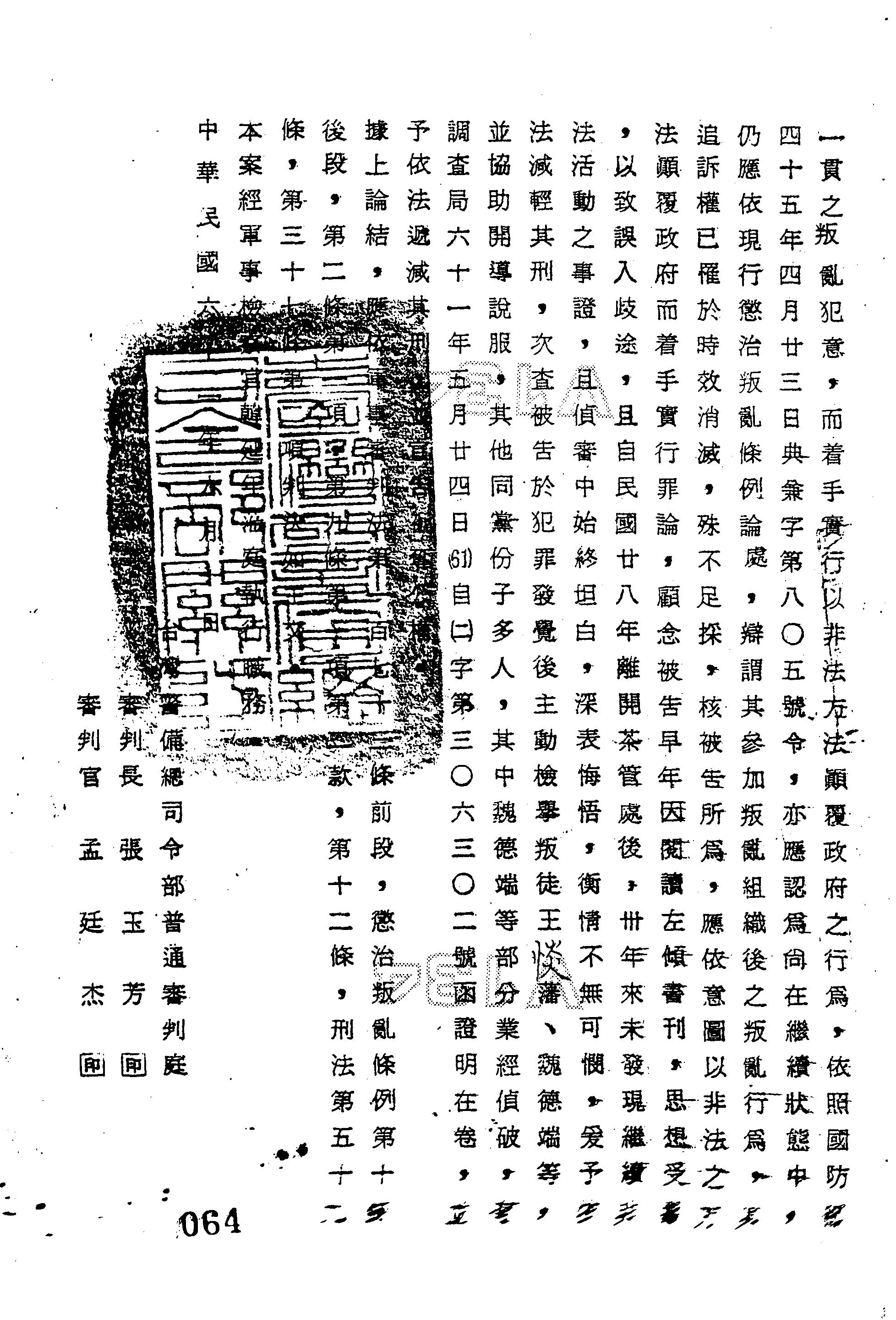 法條:軍事審判法第173條前段;懲治叛亂條例第10條後段、第2條第1項、第9條第1項第2款、第12條;刑法第59條、第37條第2項