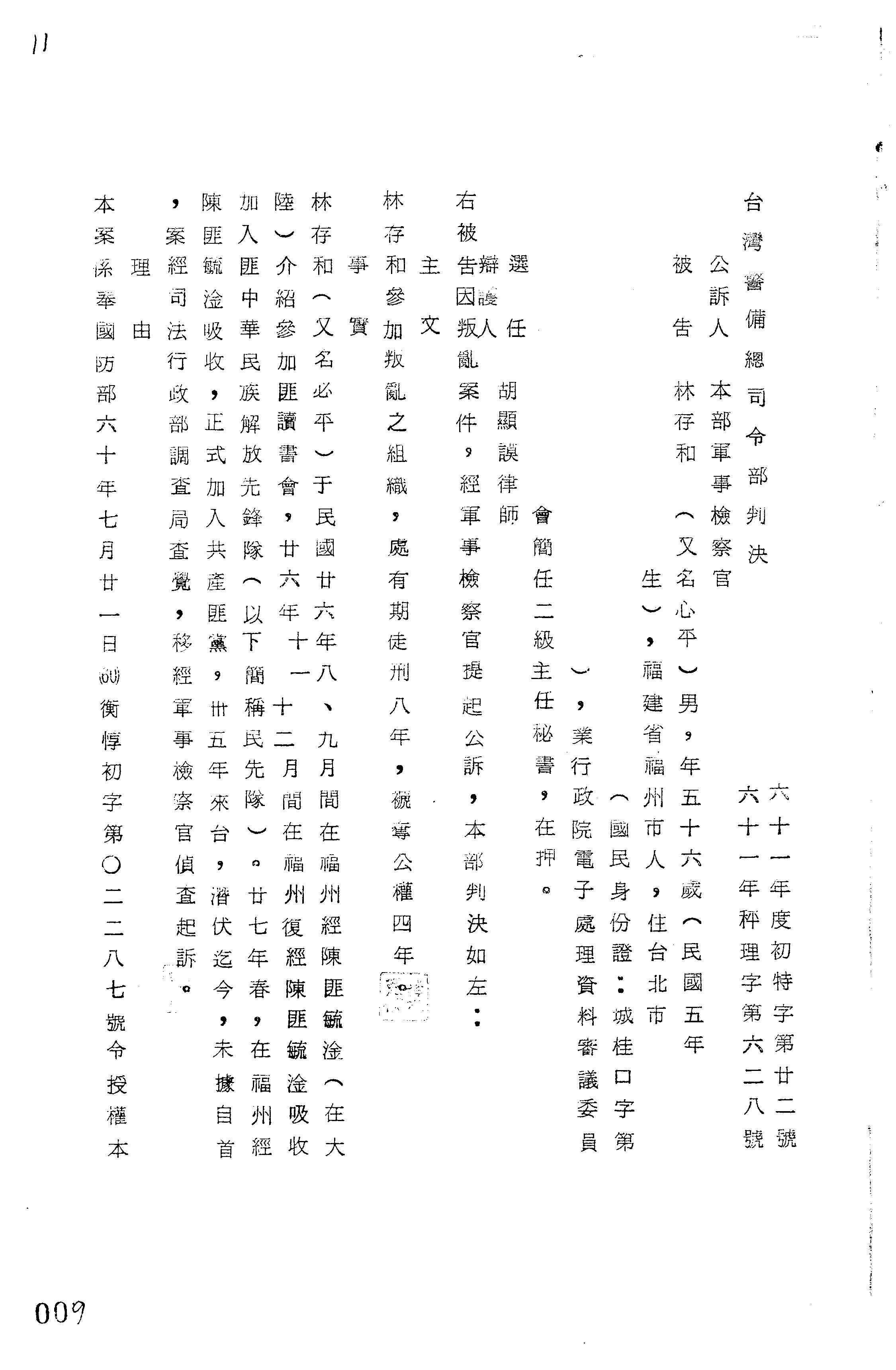 裁判書主文/要旨:林存和「參加叛亂之組織」,處有期徒刑8年,褫奪公權4年。