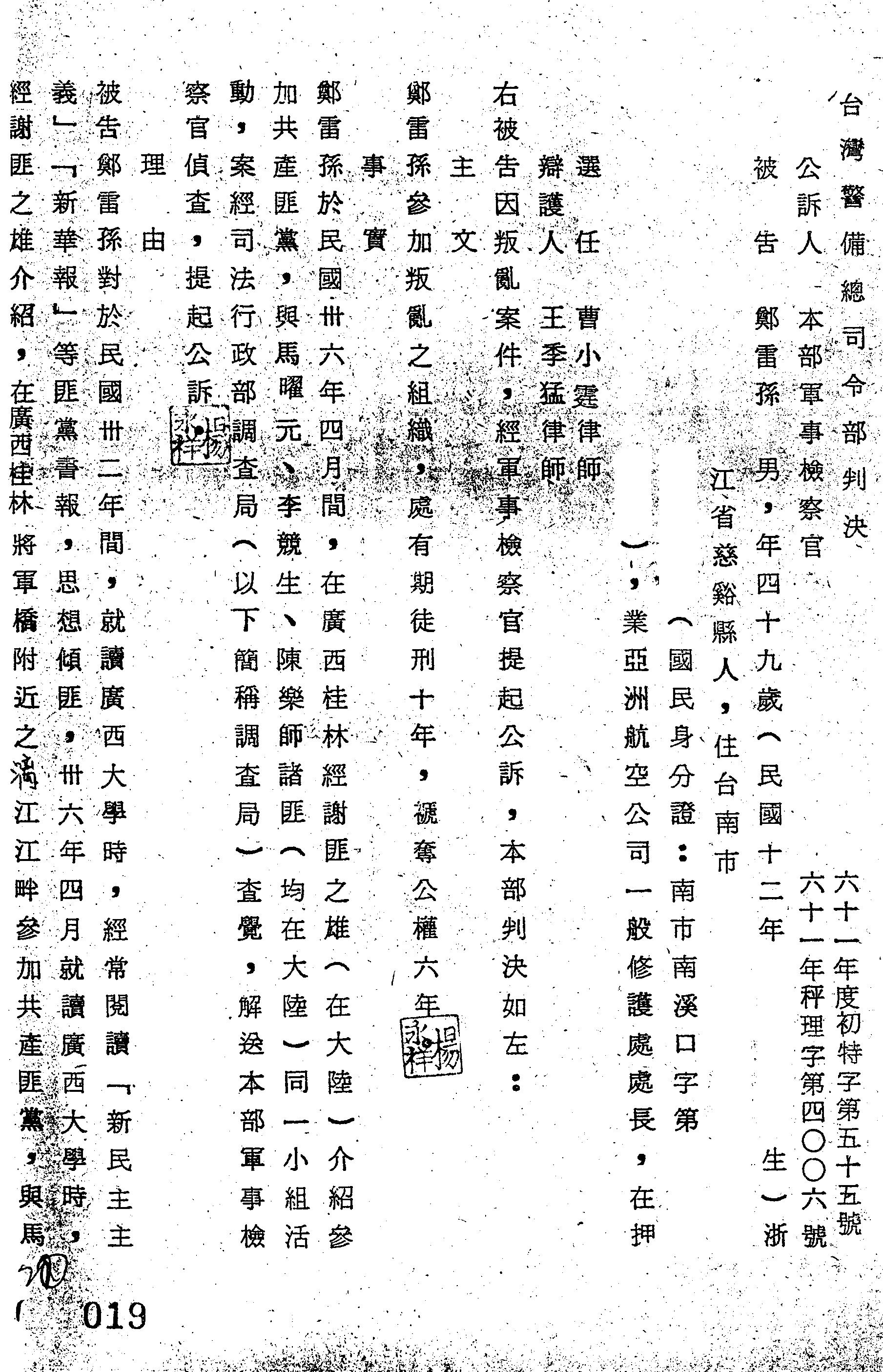 裁判書主文/要旨:鄭雷孫「參加叛亂之組織」,處有期徒刑10年,褫奪公權6年。