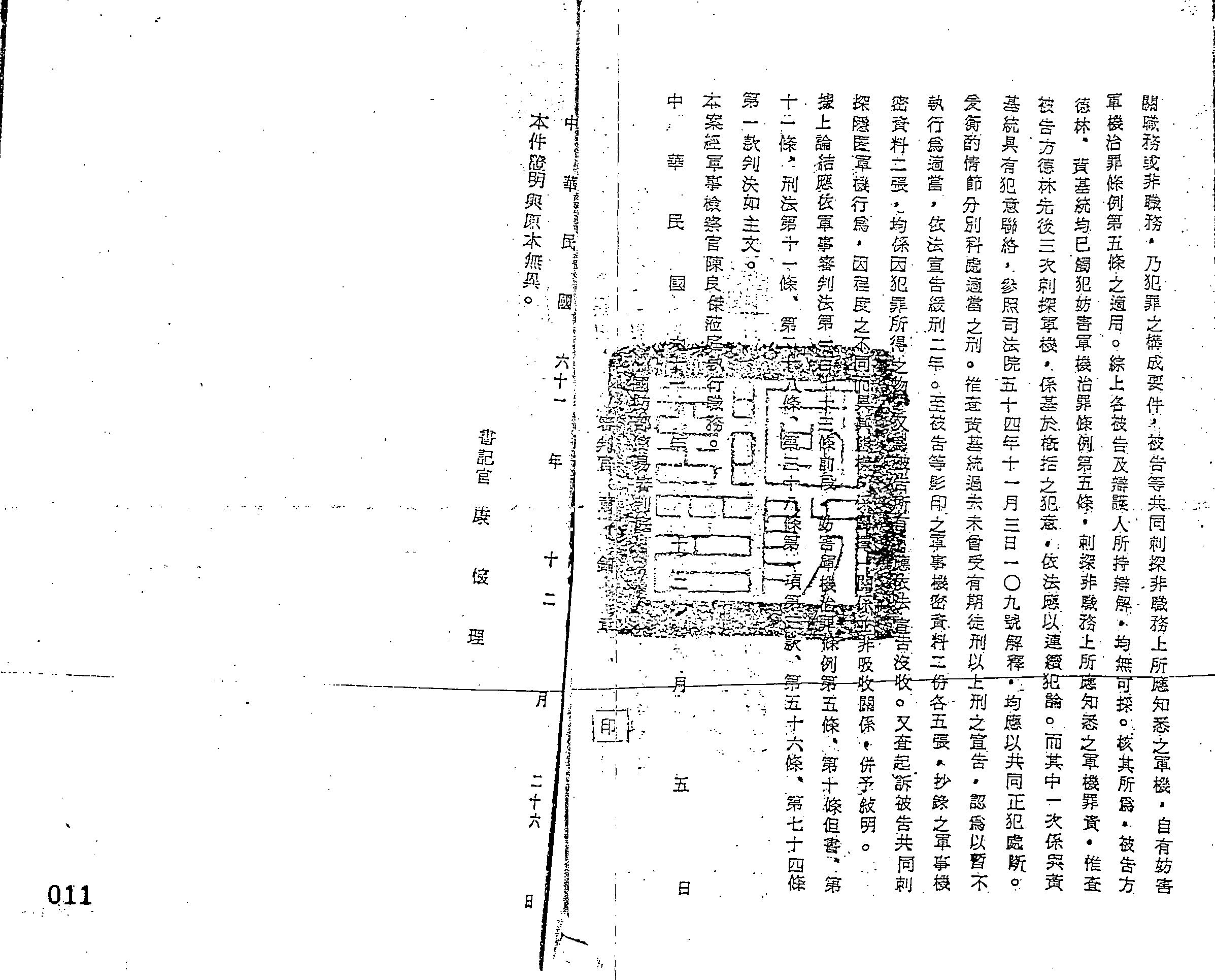 - 裁判書主文/要旨:方德林「共同連續刺探非職務上所應知悉之軍機」,處有期徒刑1年6月。黃基統「共同刺探非職務上所應知悉之軍機」,處有期徒刑1年,緩刑2年,影印之軍事機密資料2份各5張、抄錄之軍事機密資料2張均沒收。
