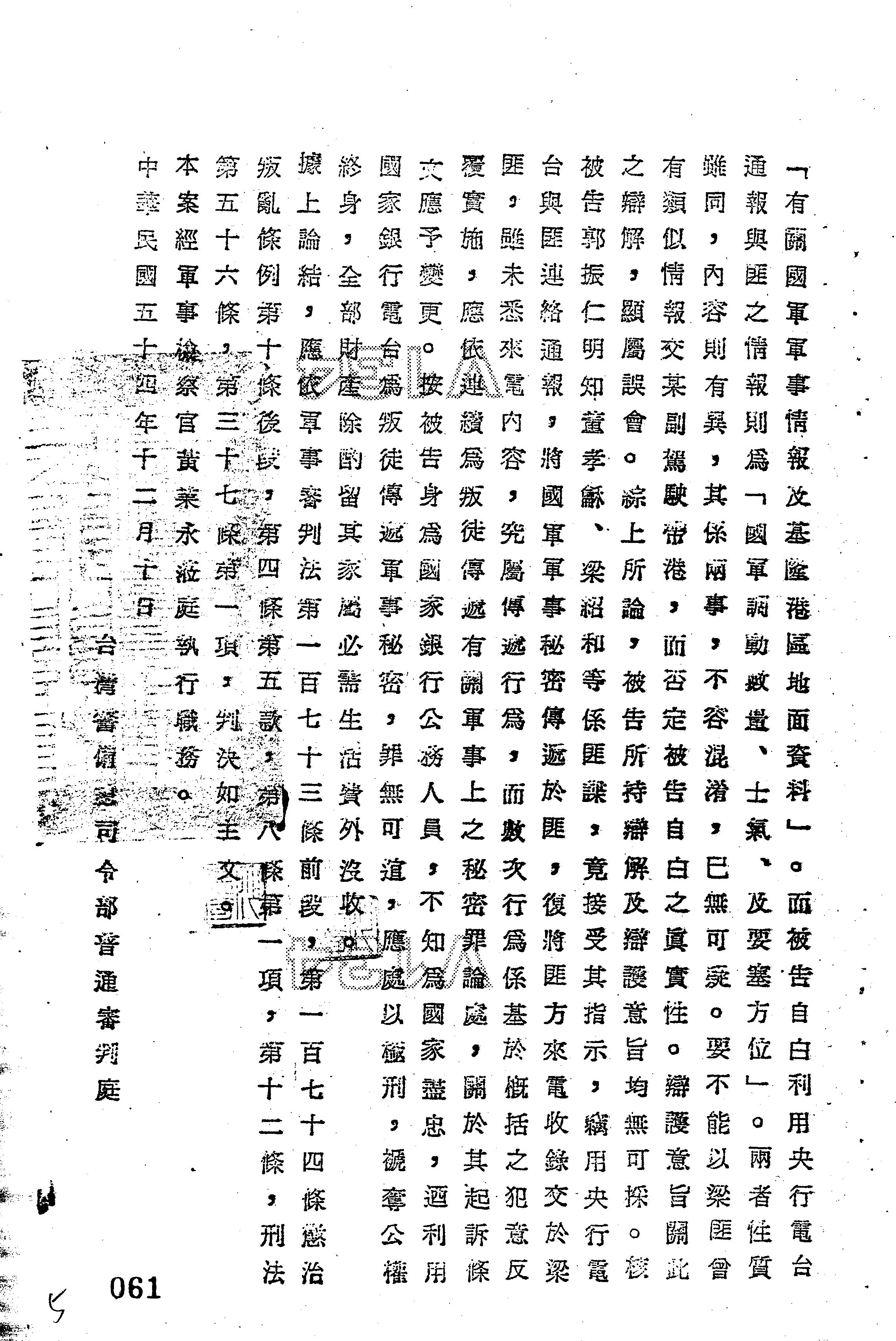 裁判書主文/要旨:郭振仁「連續為叛徒傳遞關於軍事上之秘密」,處死刑,褫奪公權終身,全部財產除酌留家屬必需生活費外沒收。
