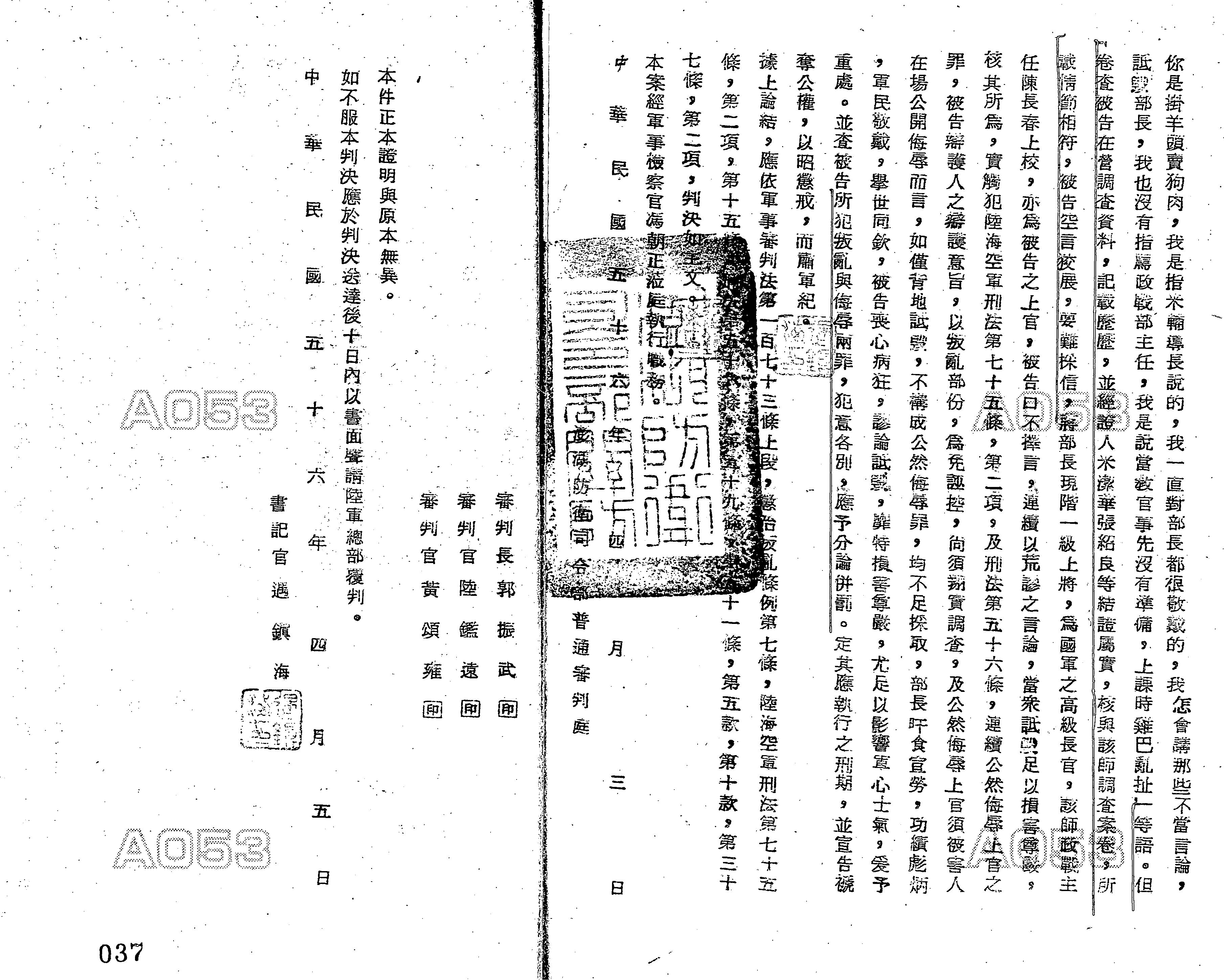 - 法條:軍事審判法第173條前段;懲治叛亂條例第7條;陸海空軍刑法第75條第2項、第15條;刑法第55條、第56條、第51條第5款、第51條第10款、第37條第2項