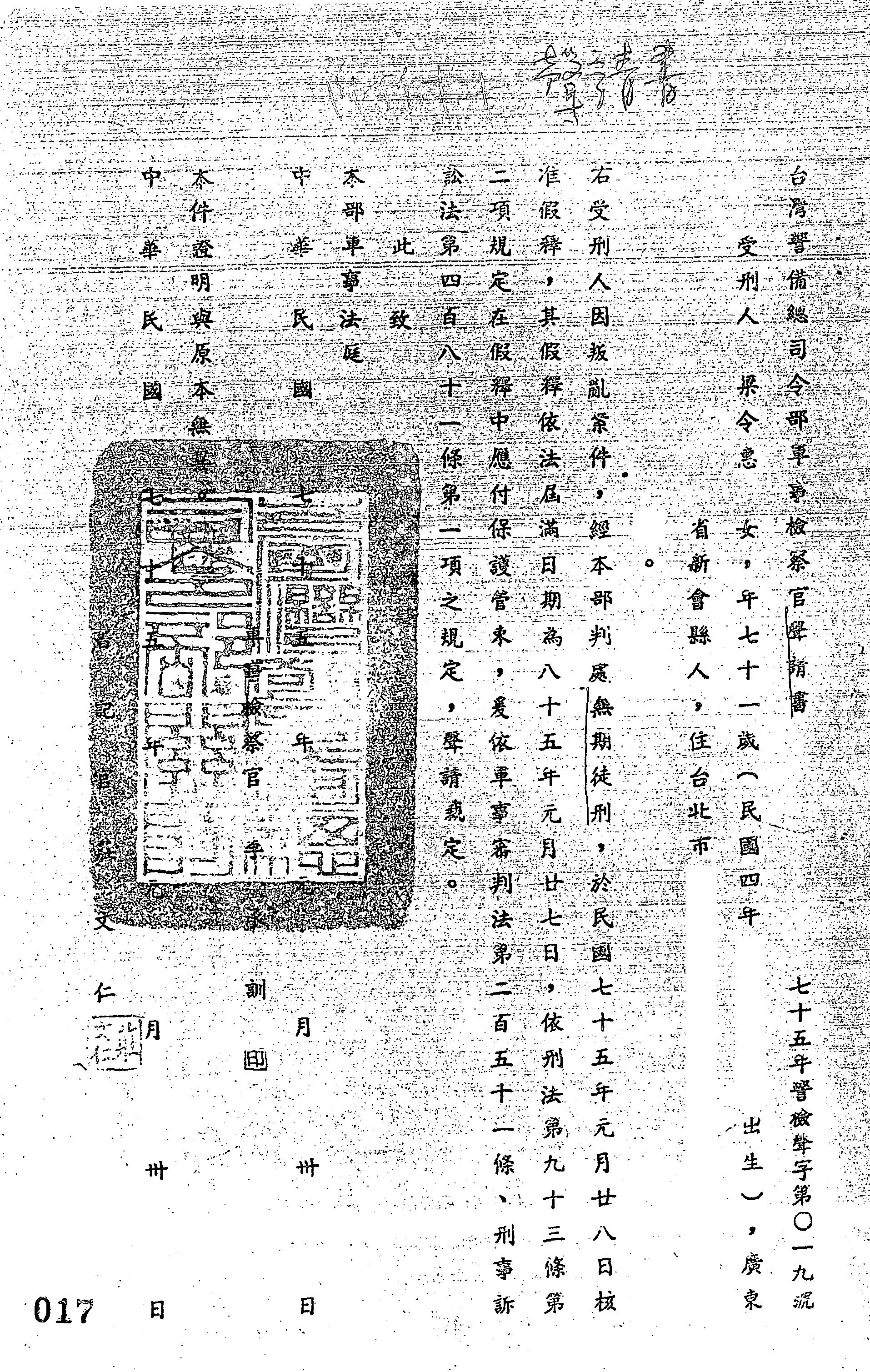 臺灣警備總司令部75年警檢聲字第0019號軍事檢察官聲請書