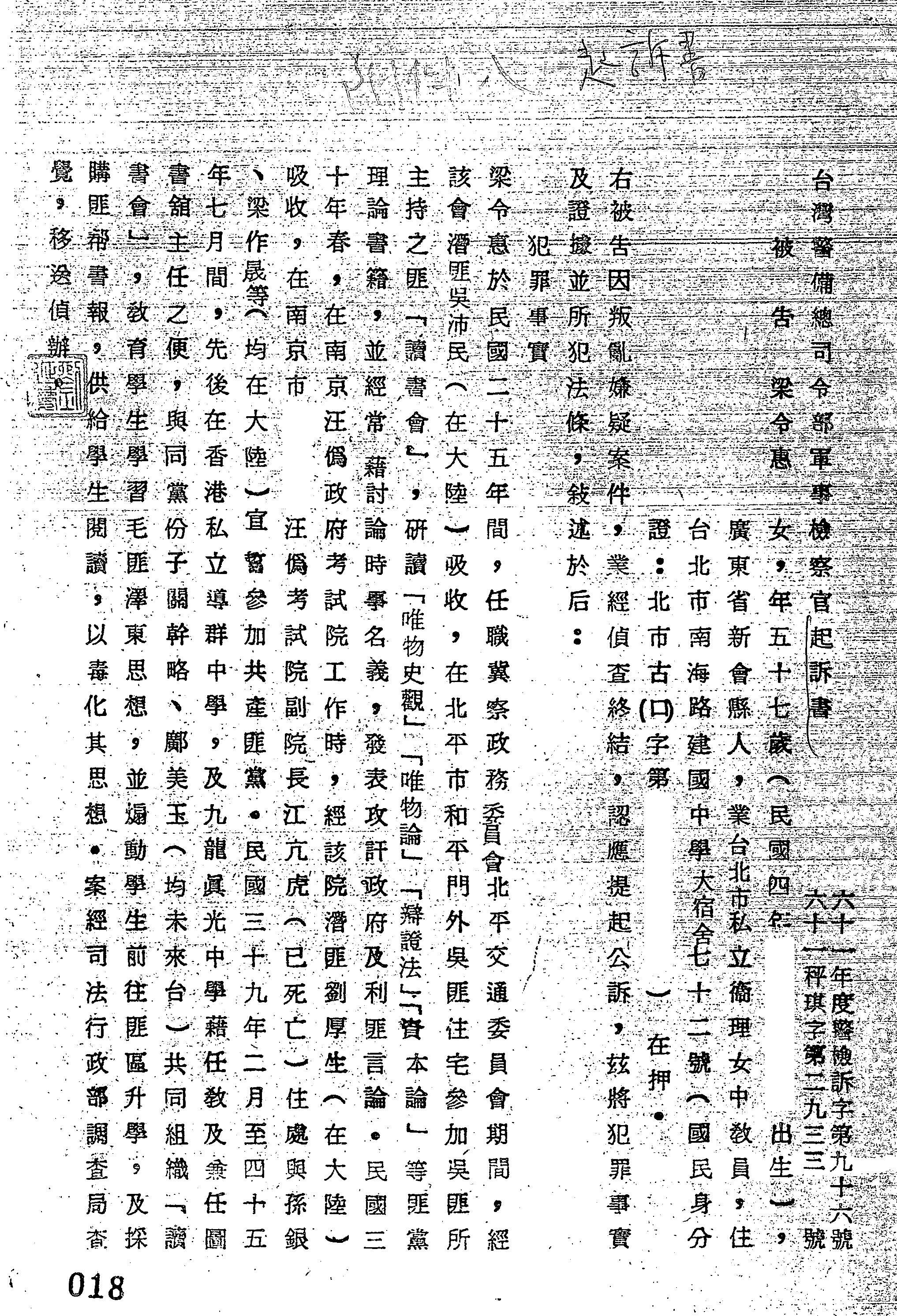 裁判書主文/要旨:梁令惠因叛亂案件判處無期徒刑,於民國七十五年核准假釋,聲請裁定在假釋中應付保護管束。