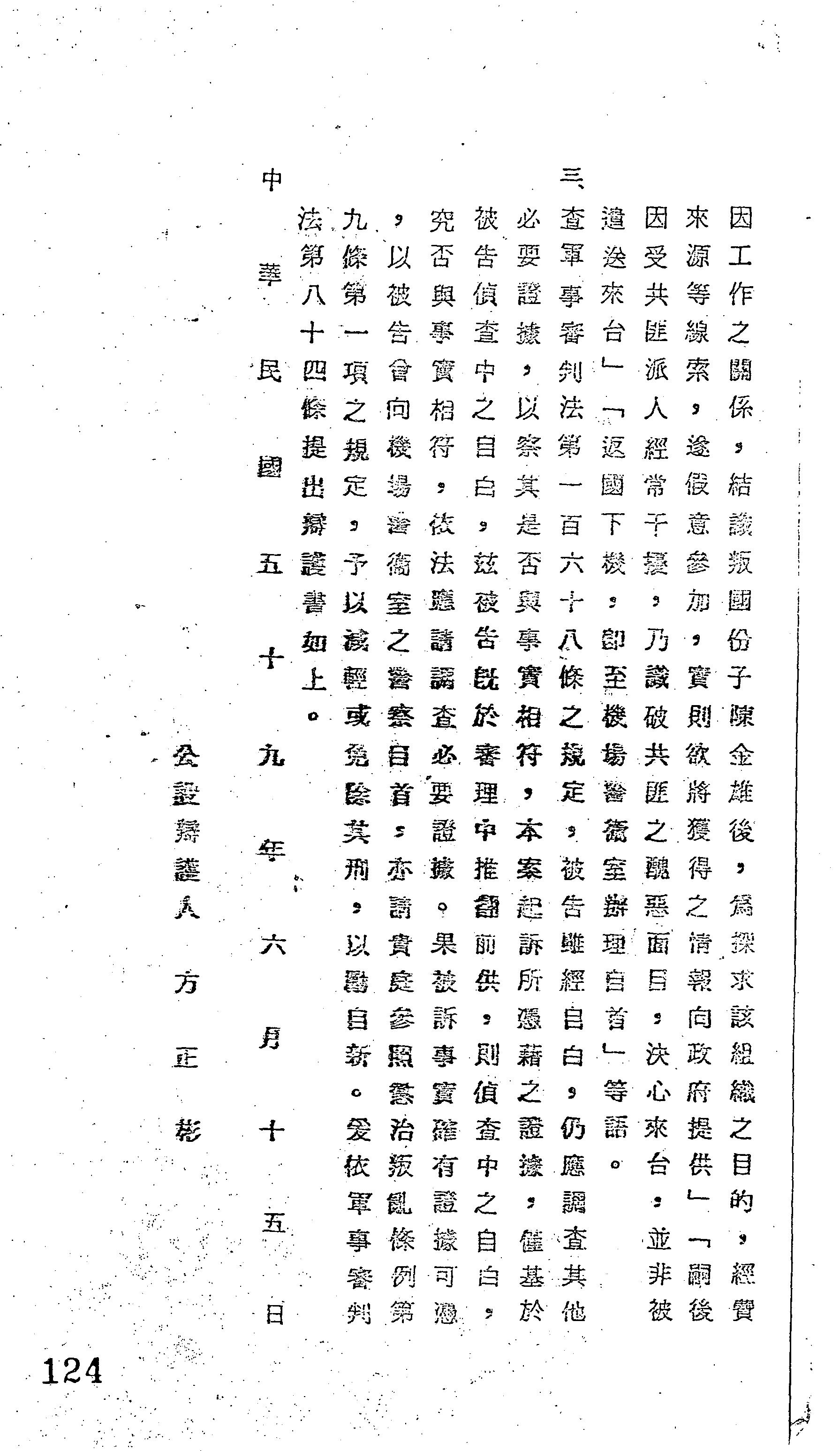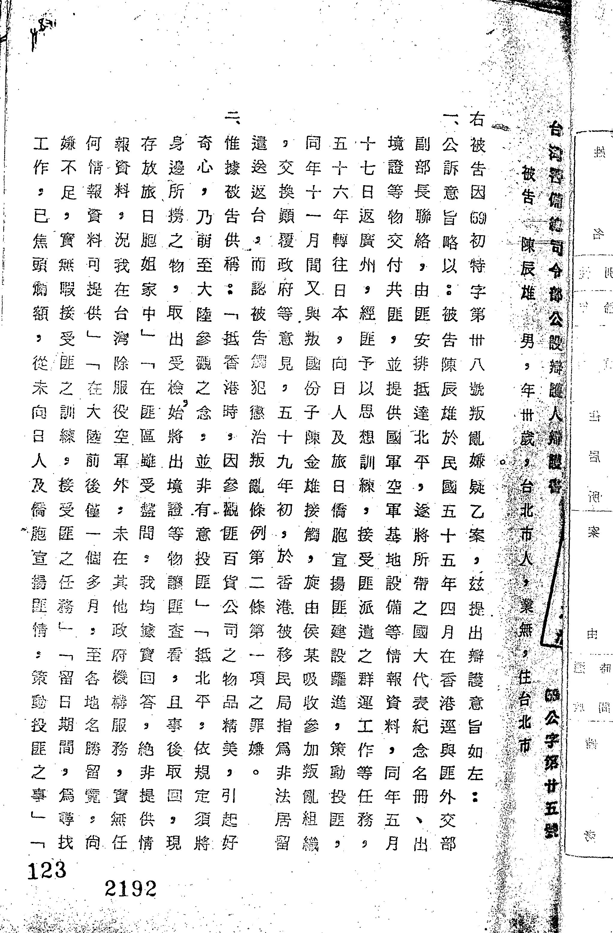 裁判書主文/要旨:就陳辰雄因(59)初特字第卅八叛亂嫌疑乙案提出辯護。