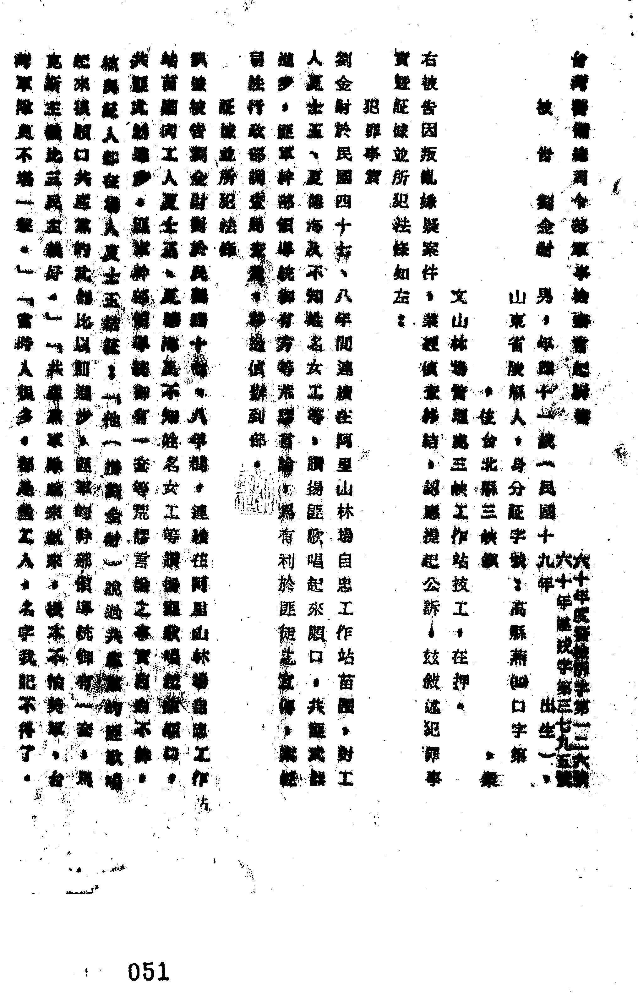裁判書主文/要旨:劉金財因叛亂嫌疑案件業經偵查終結認應提起公訴。