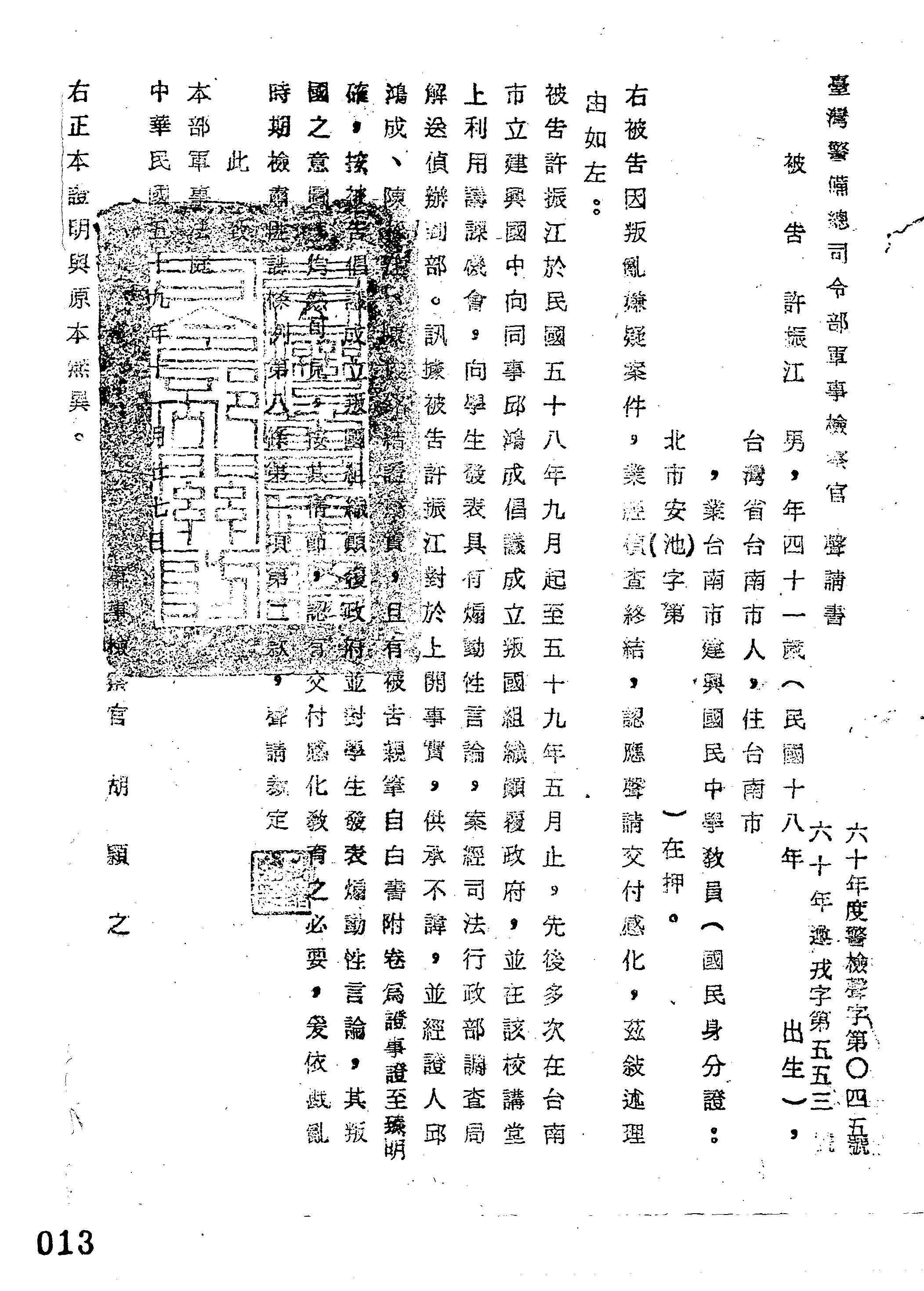 臺灣警備總司令部60年警檢聲字第0045號/60年遵戎字第0553號軍事檢察官聲請書