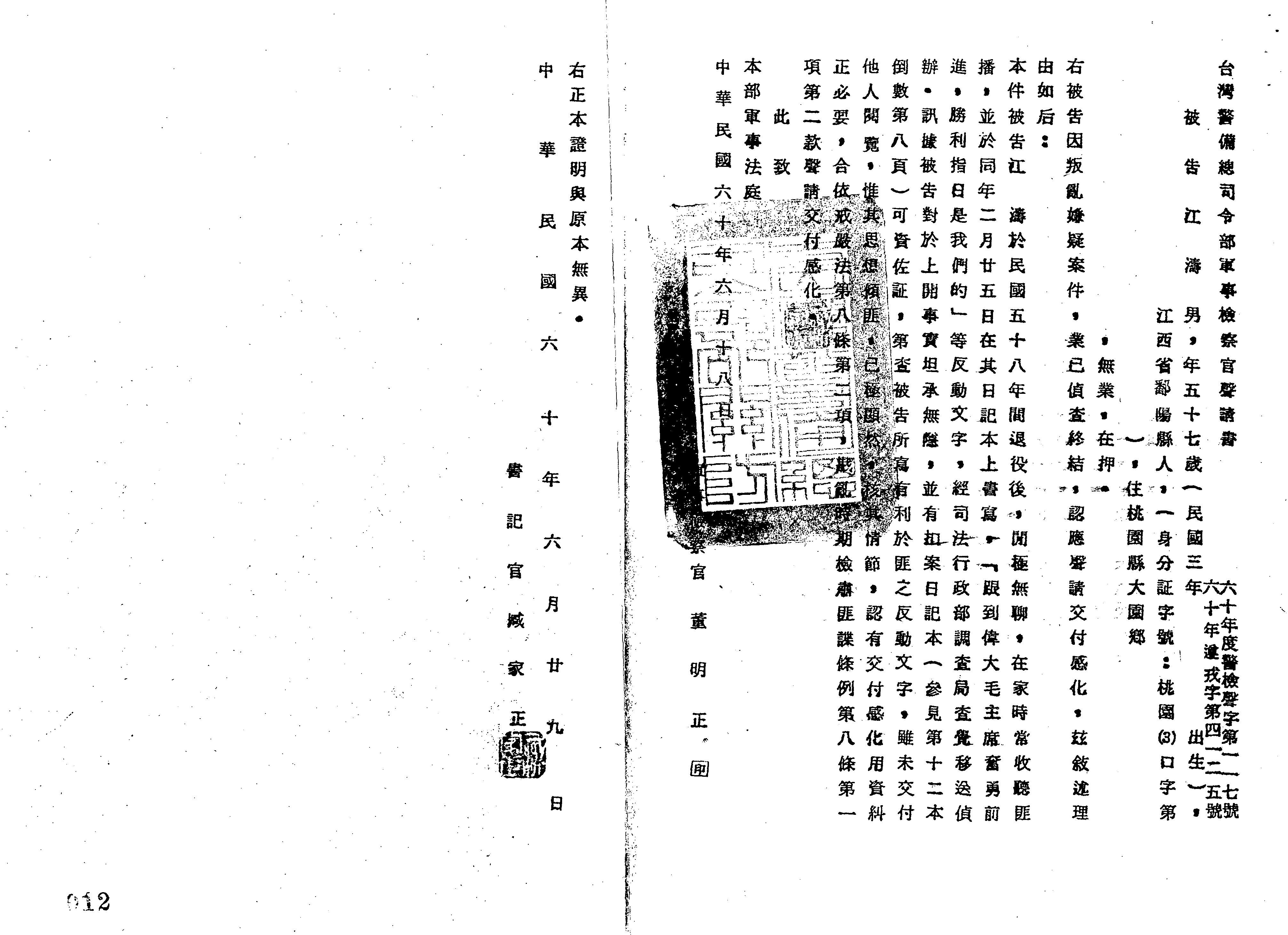裁判書主文/要旨:江濤因叛亂嫌疑案件,業經偵查終結,認應聲請交付感化。