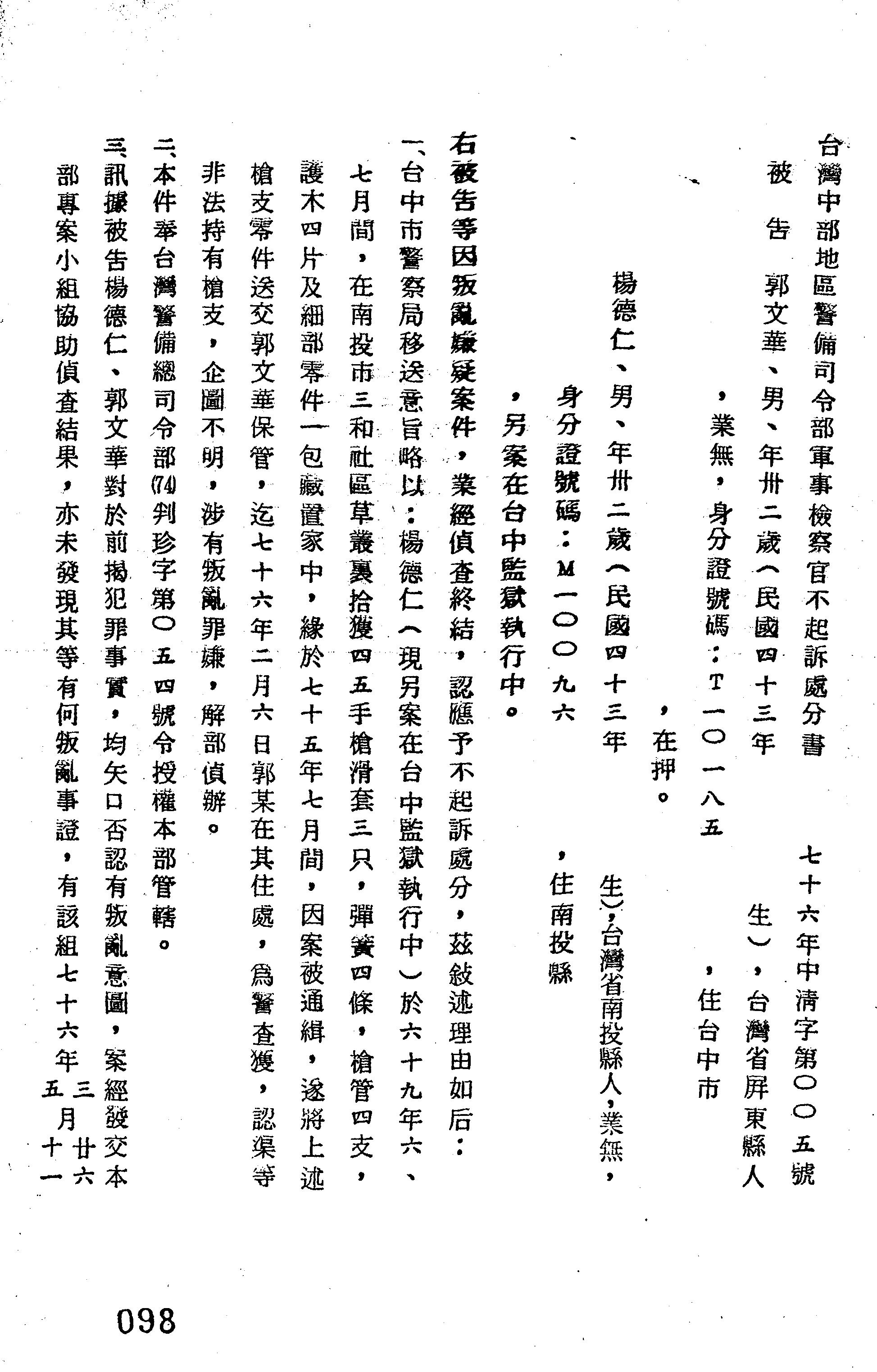 裁判書主文/要旨:郭文華等因叛亂嫌疑案件業經偵查終結認應予不起訴處分。