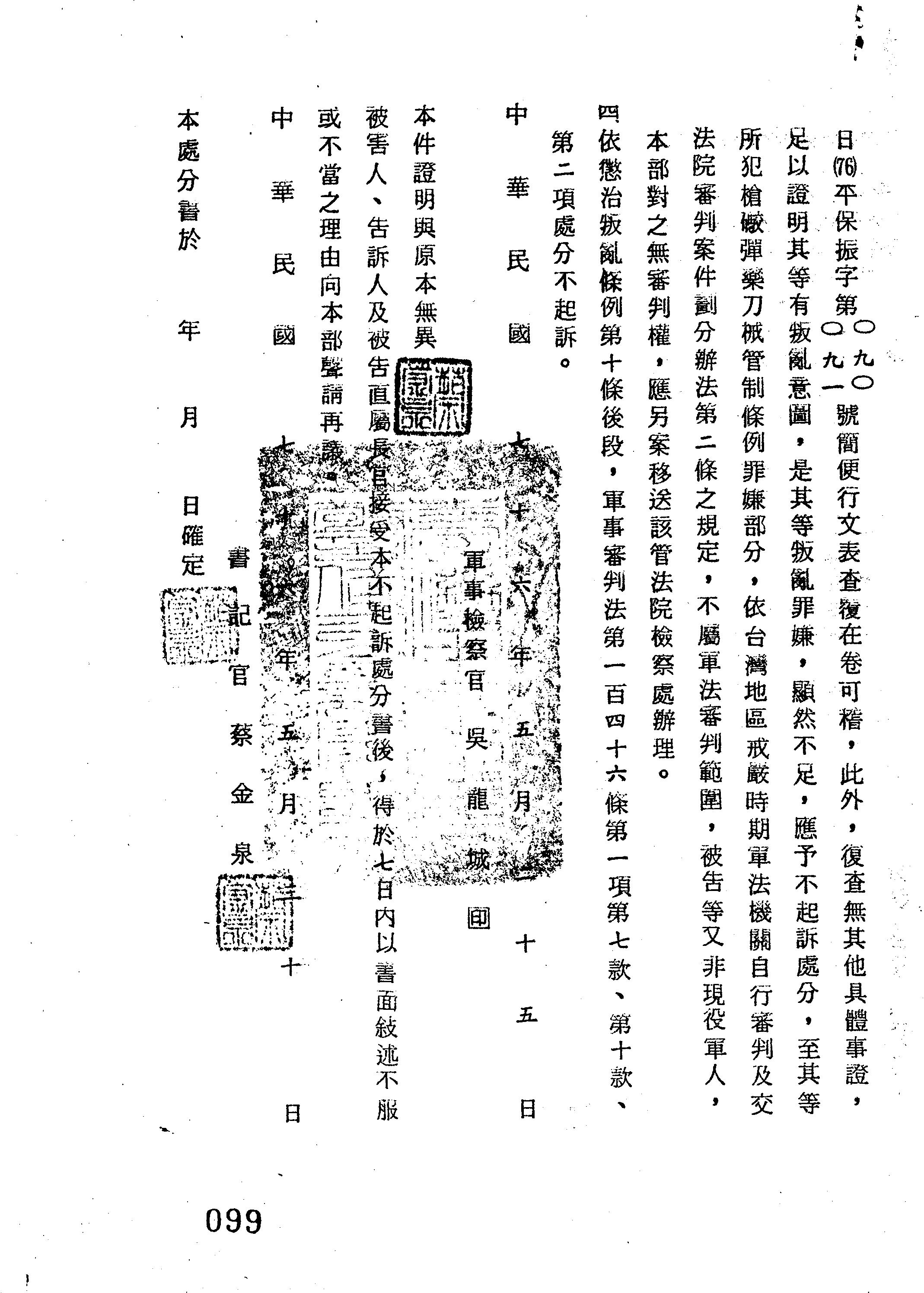 臺灣中部地區警備司令部76年中清字第0005號軍事檢察官不起訴處分書