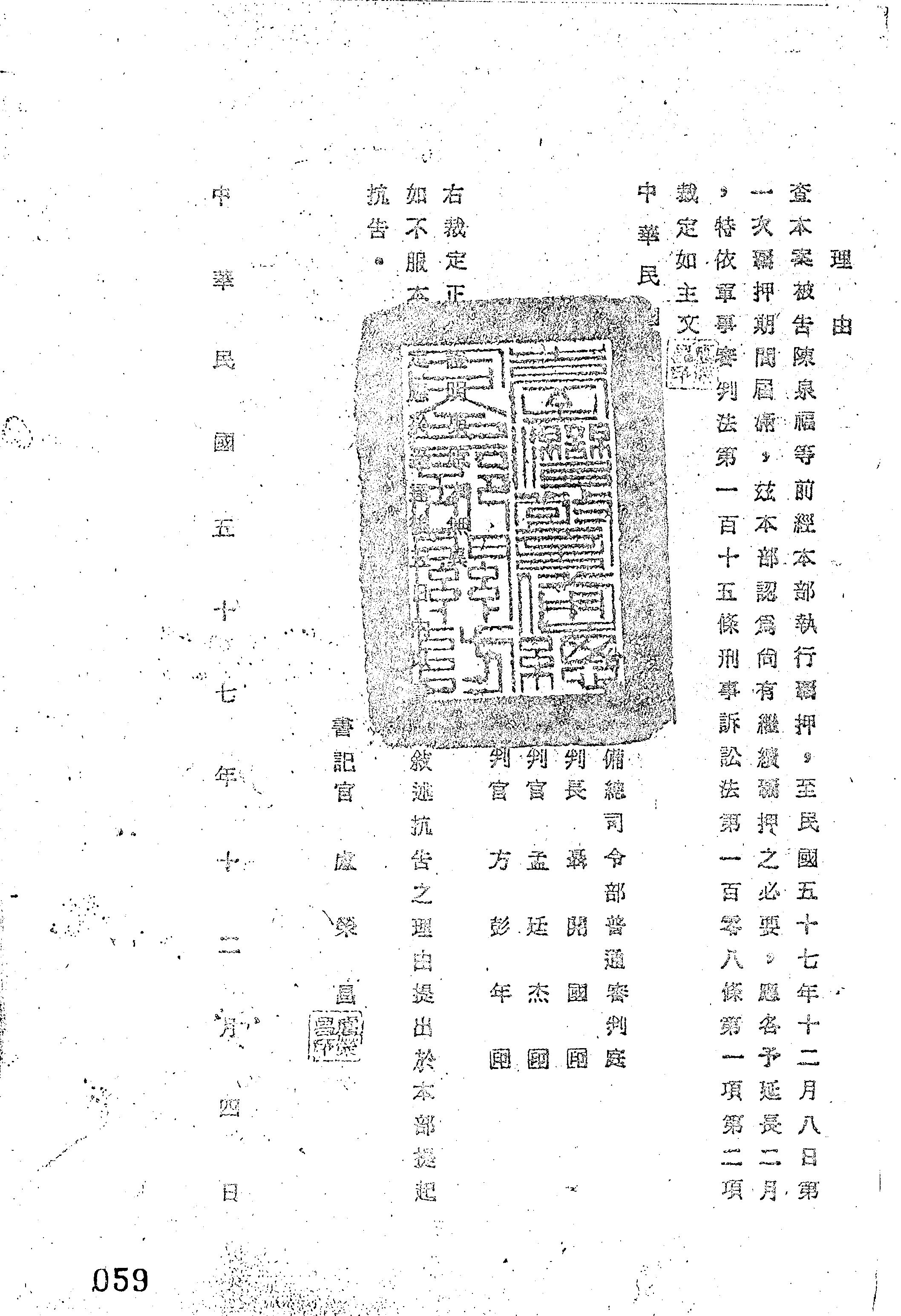 臺灣警備總司令部57年訟神字第6181號裁定書