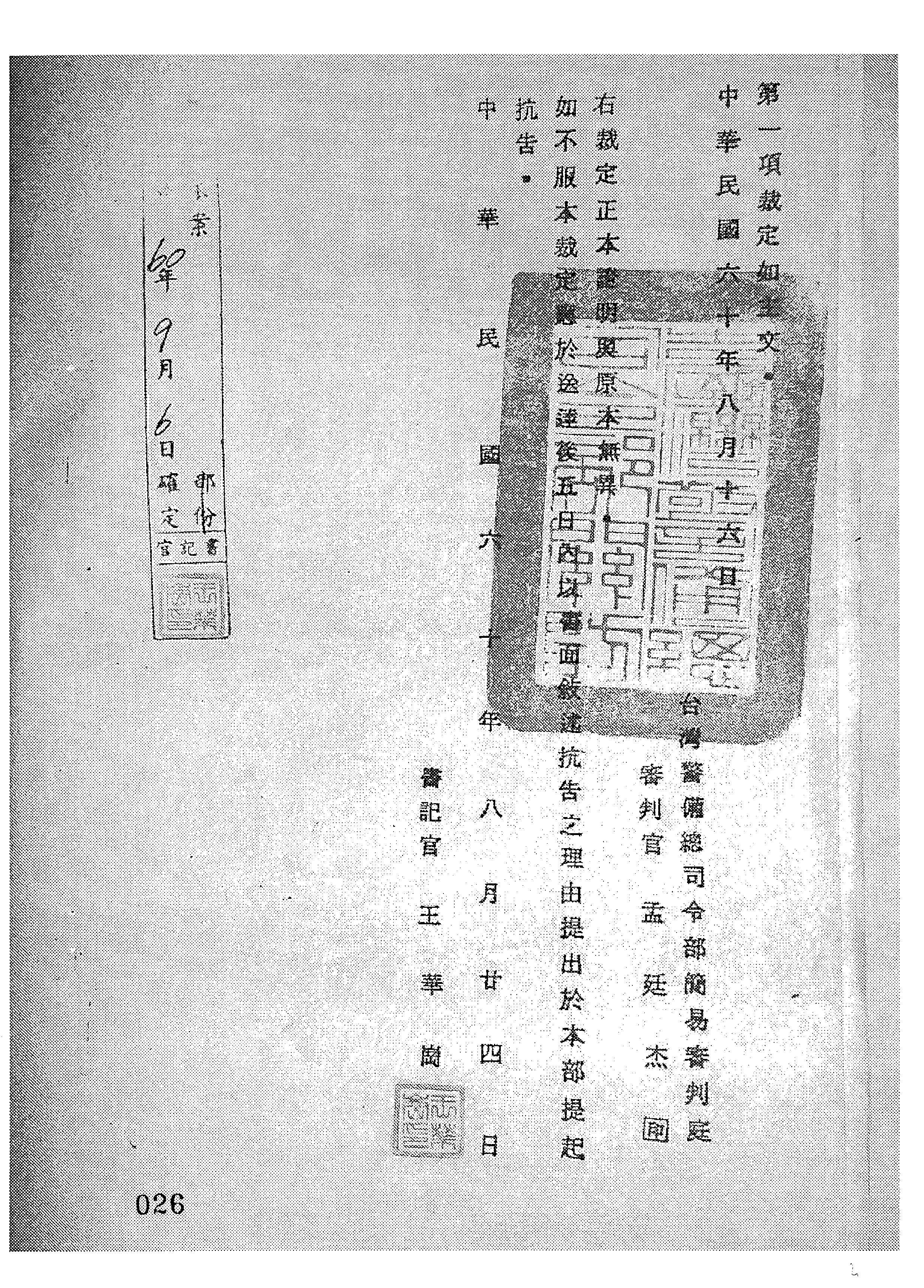 臺灣警備總司令部61年裁化字第0003號/60年遵威字第5377號裁定書