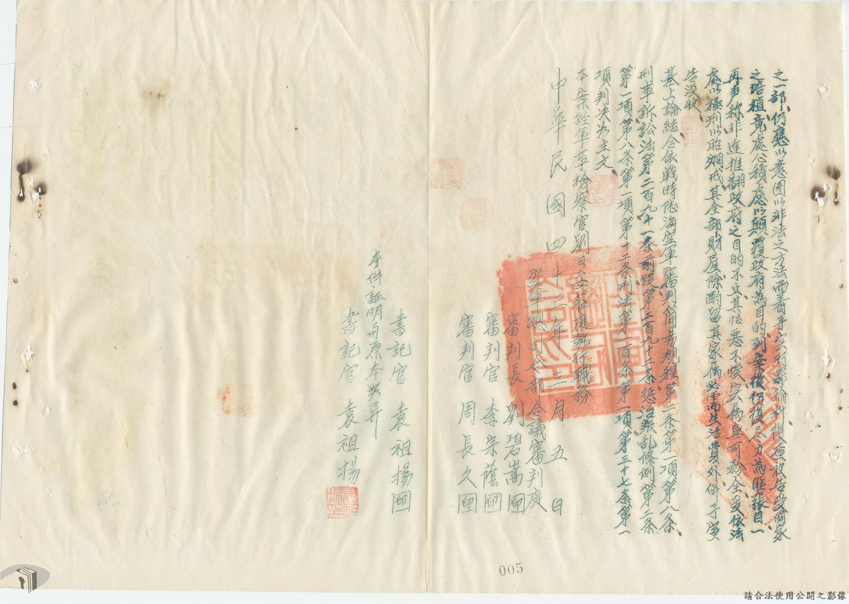 法條:戰時陸海軍審判簡易規程第2條第1項、第8條;刑事訴訟法第291條前段、第292條;懲治叛亂條例第2條第1項、第8條第1項、第12條;刑法第100條第1項,第37條第1項