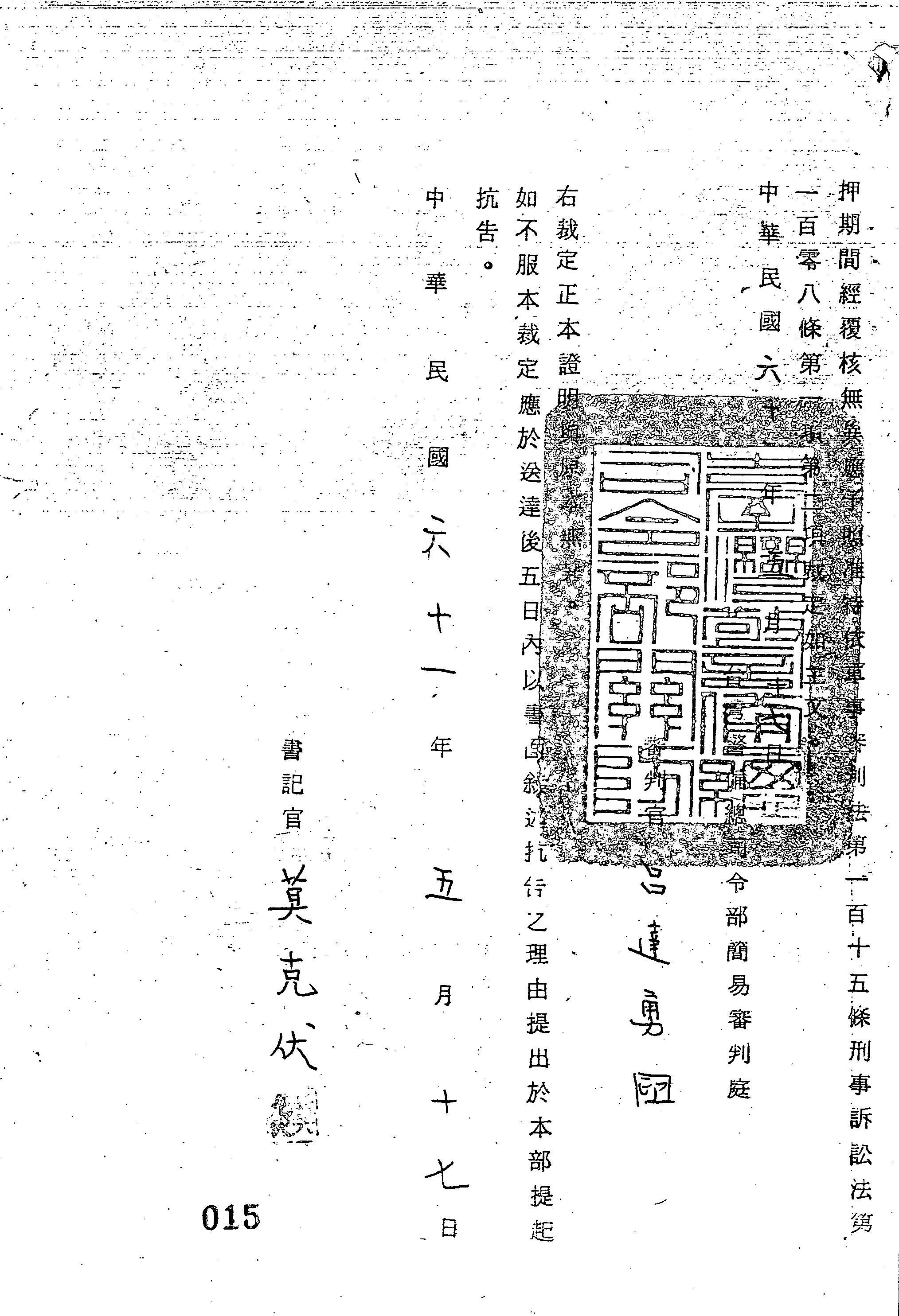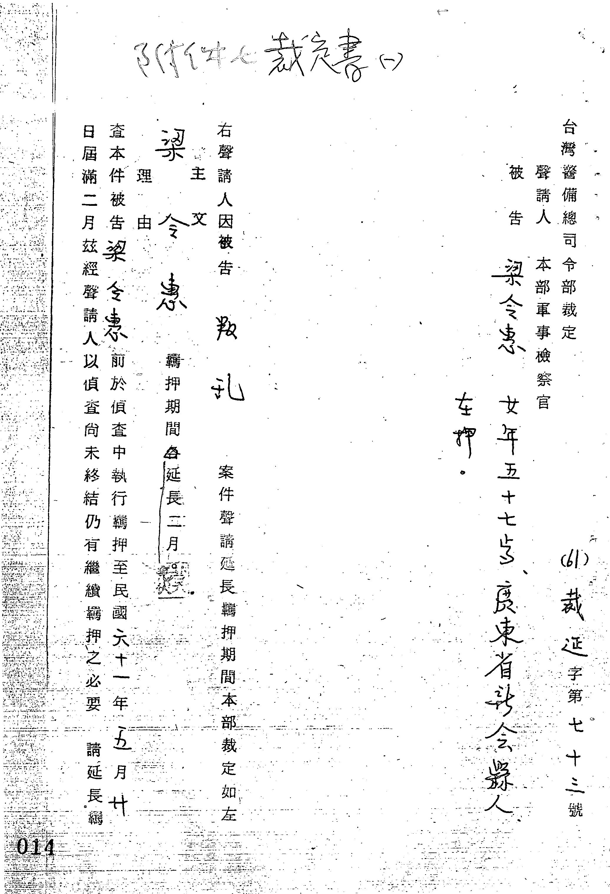 臺灣警備總司令部61年裁延字第0073號裁定書