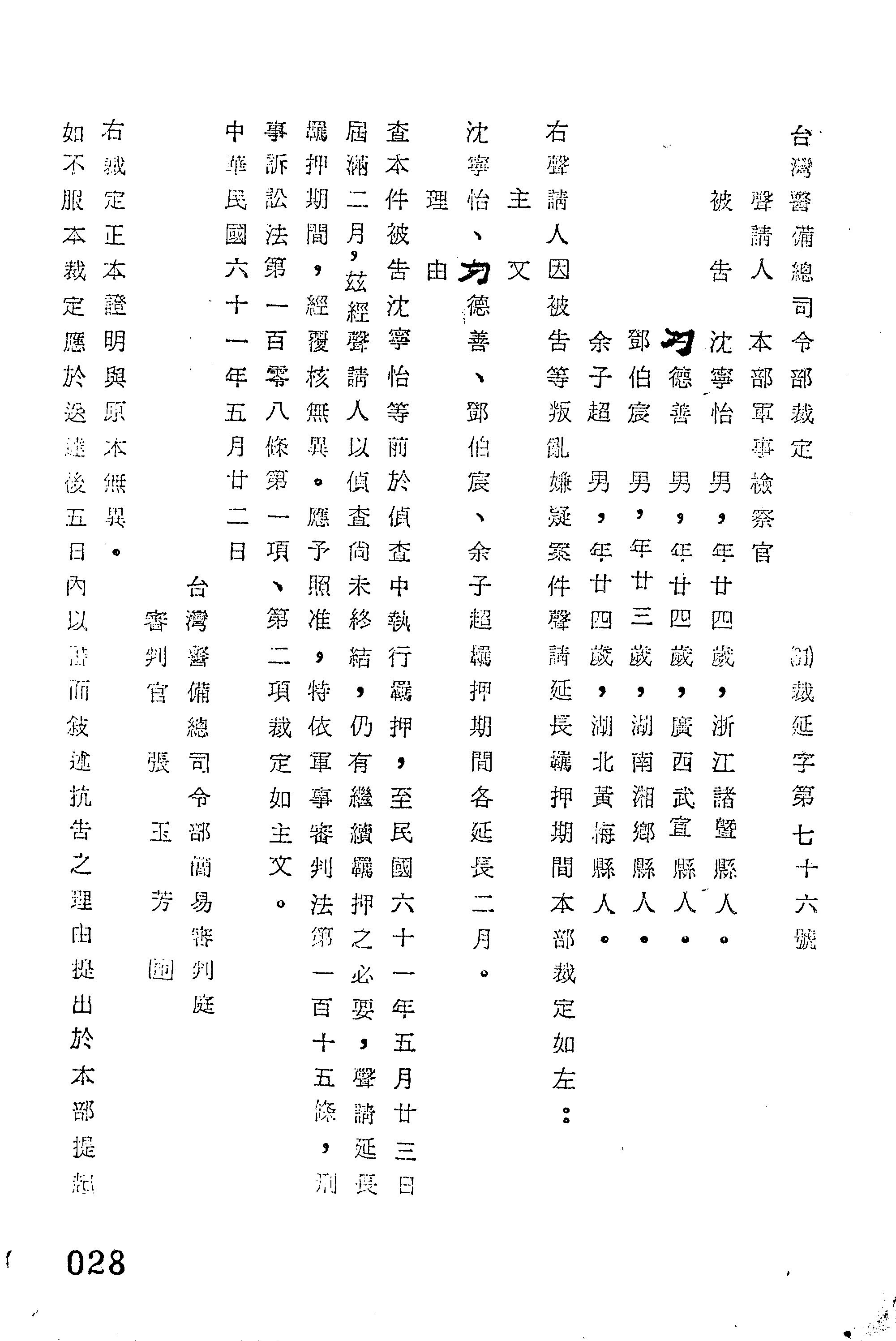 臺灣警備總司令部61年裁延字第0076號裁定書