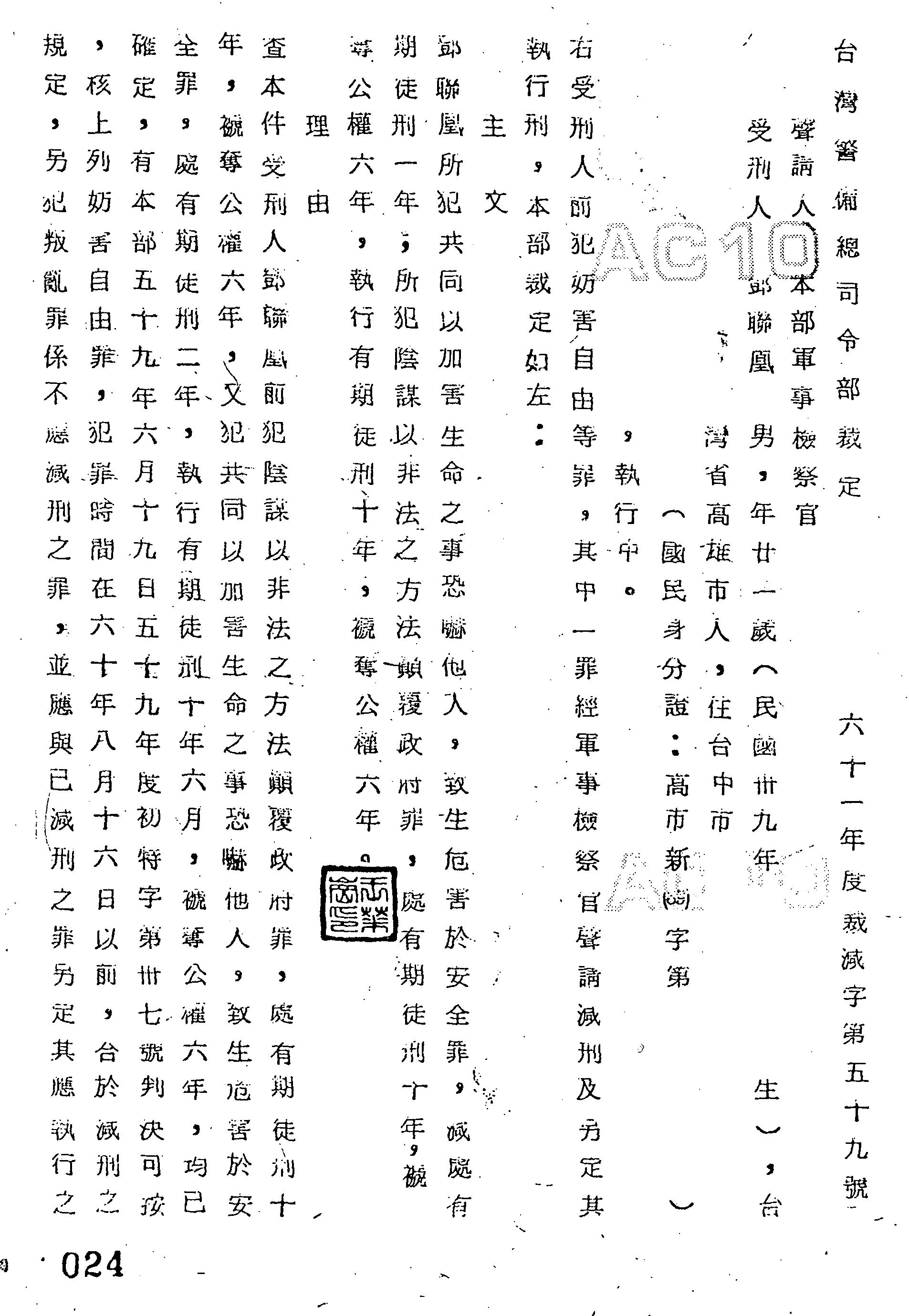 臺灣警備總司令部61年裁減字第0059號裁定書