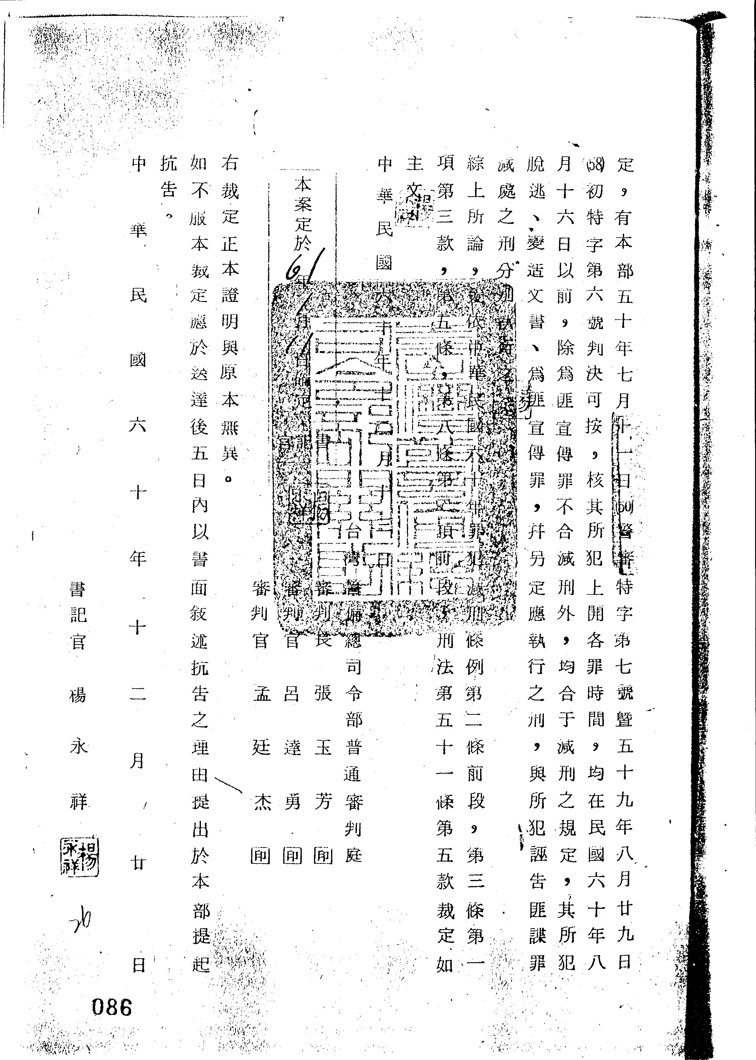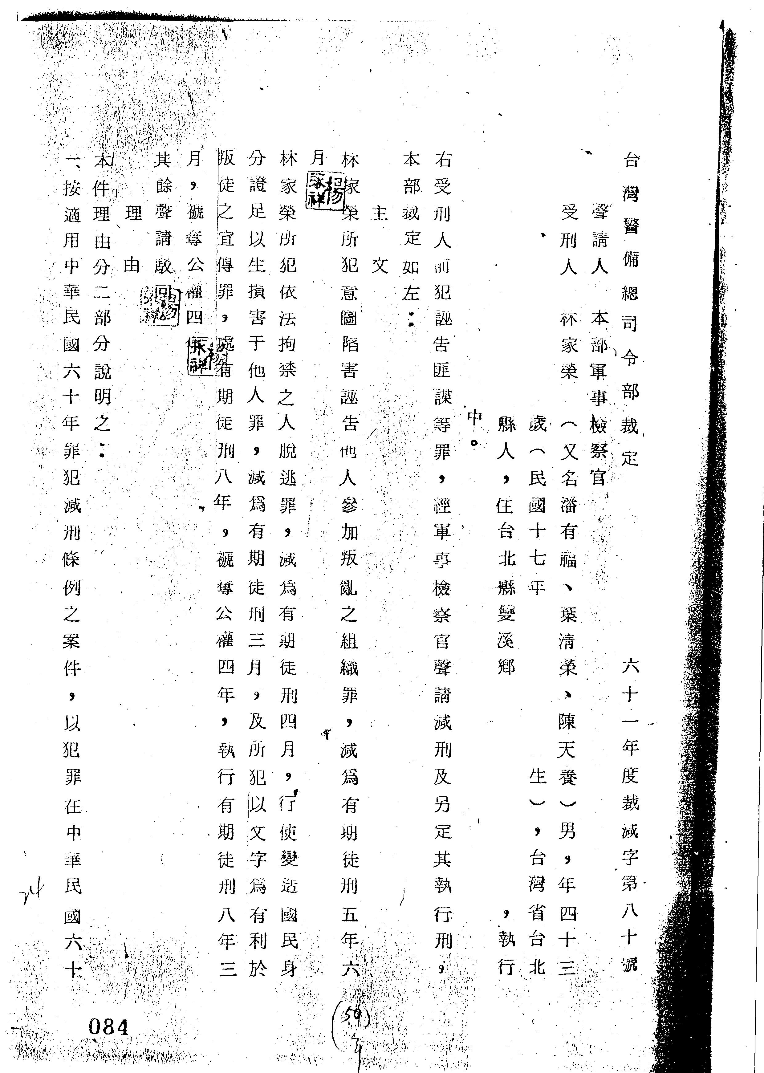 臺灣警備總司令部61年裁減字第0080號裁定書