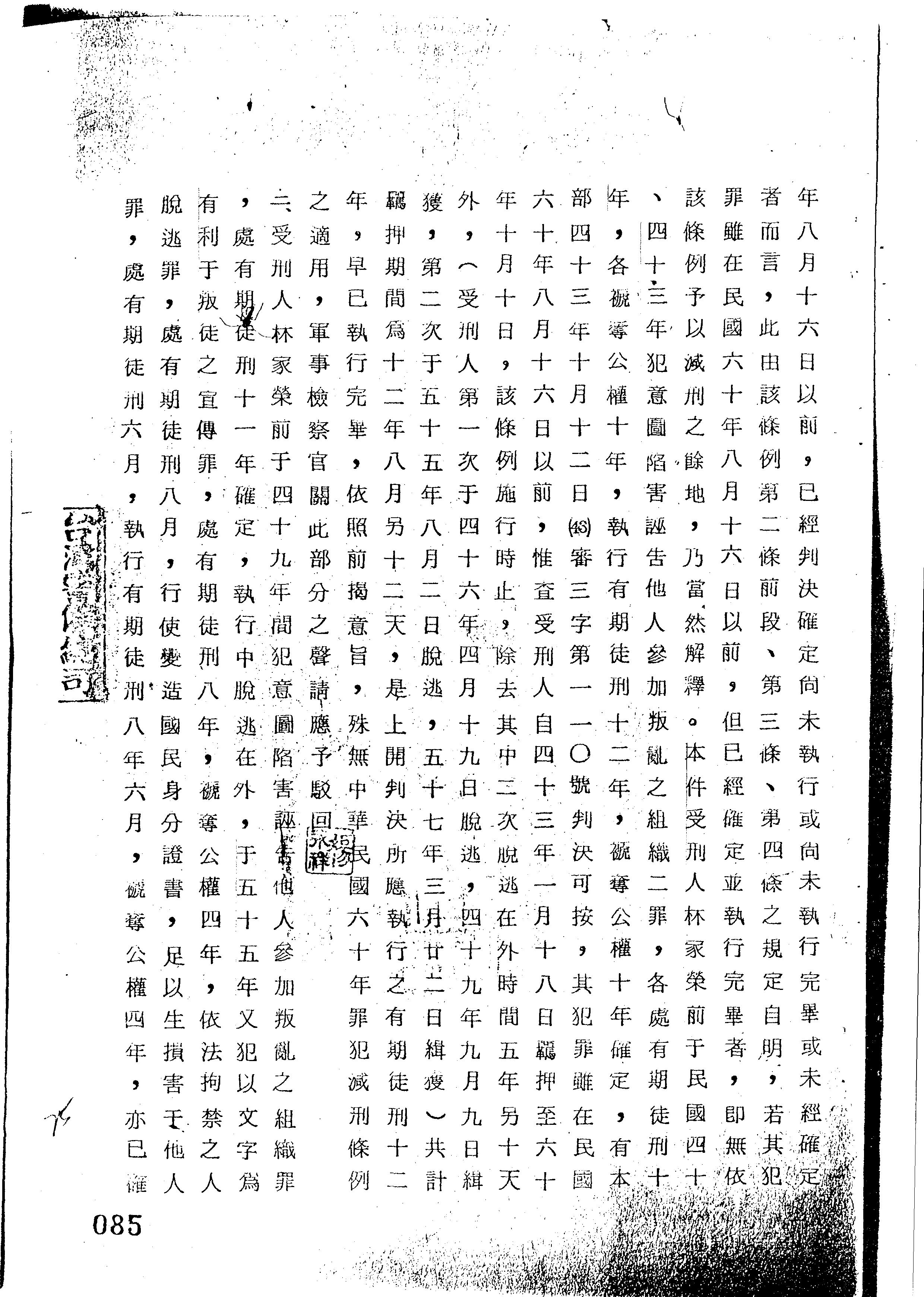 - 裁判書主文/要旨:林家榮所犯「意圖陷害誣告他人參加叛亂之組織罪」,減為有期徒刑5年6月;林家榮所犯「依法拘禁之人脫逃罪」,減為有期徒刑4月;「行使變造國民身分證足以生損害于他人罪」,減為有期徒刑3月;及所犯「以文字為有利於叛徒之宣傳罪」,處有期徒刑8年,褫奪公權4年;執行有期徒刑8年3月,褫奪公權4年;其餘聲請駁回。