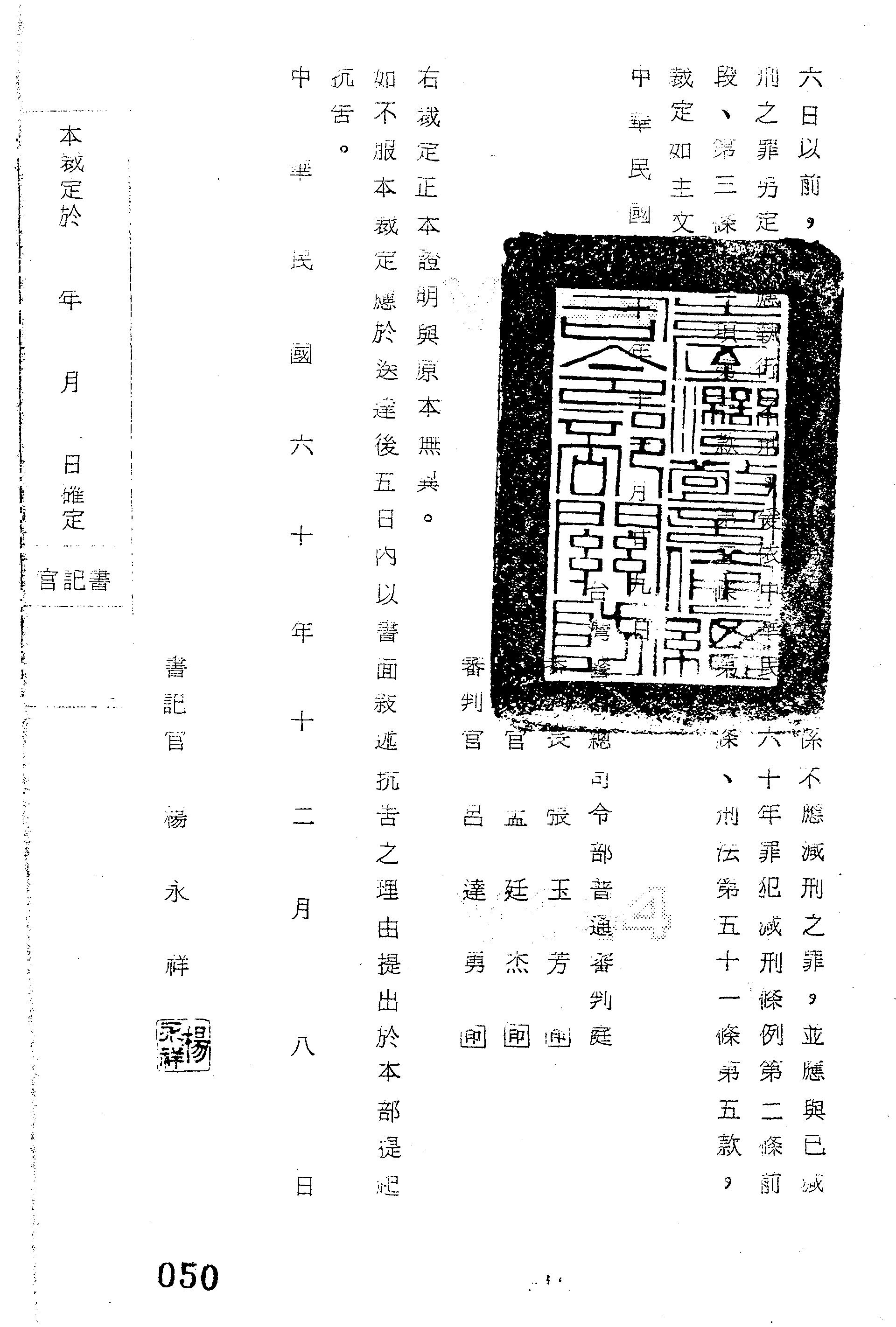 臺灣警備總司令部61年裁減字第0148號裁定書