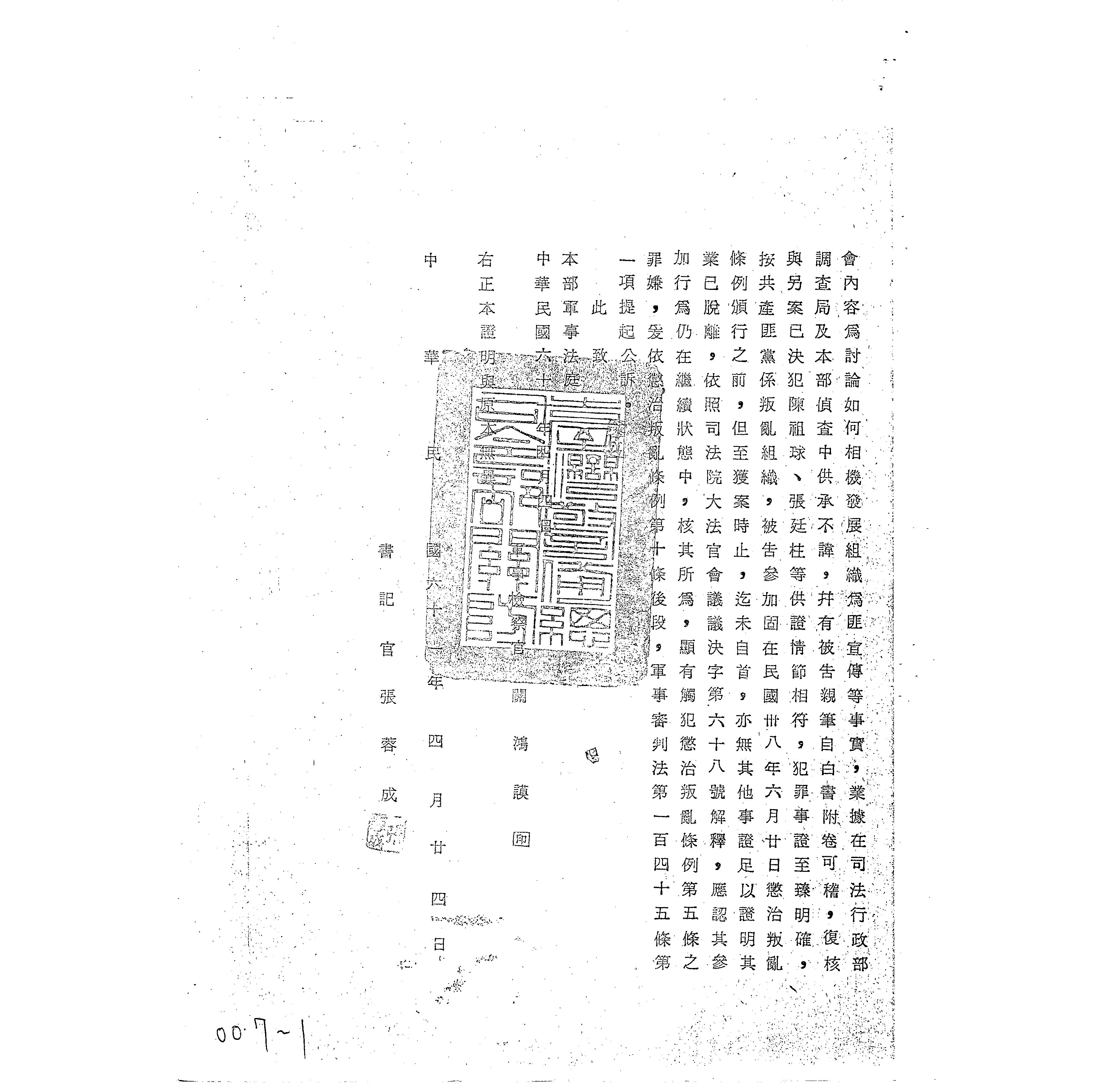 裁判書主文/要旨:陳齊鋆因叛亂嫌疑案件業經偵查終結認應提起公訴。
