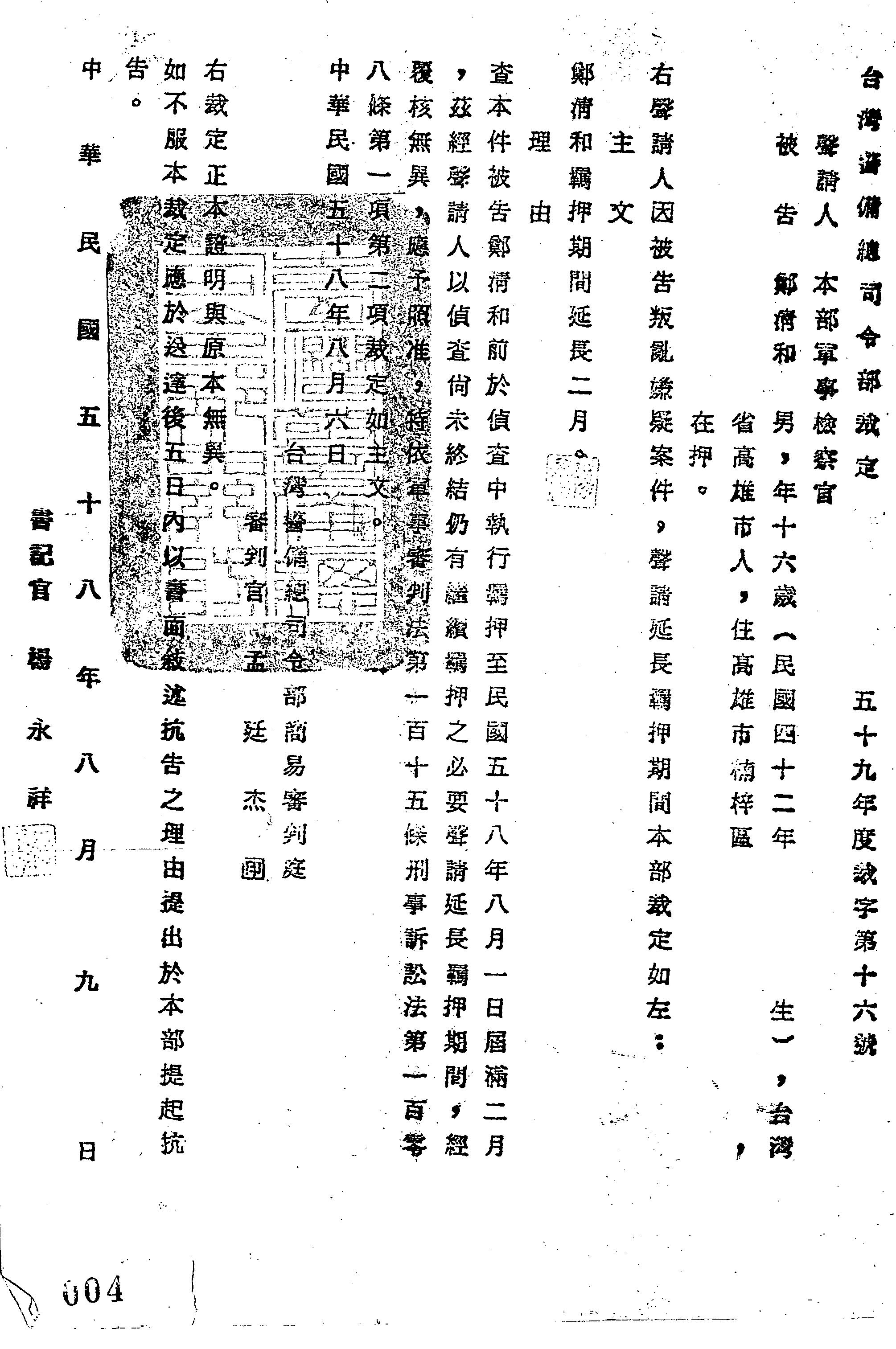 臺灣警備總司令部59年裁字第0016號裁定書