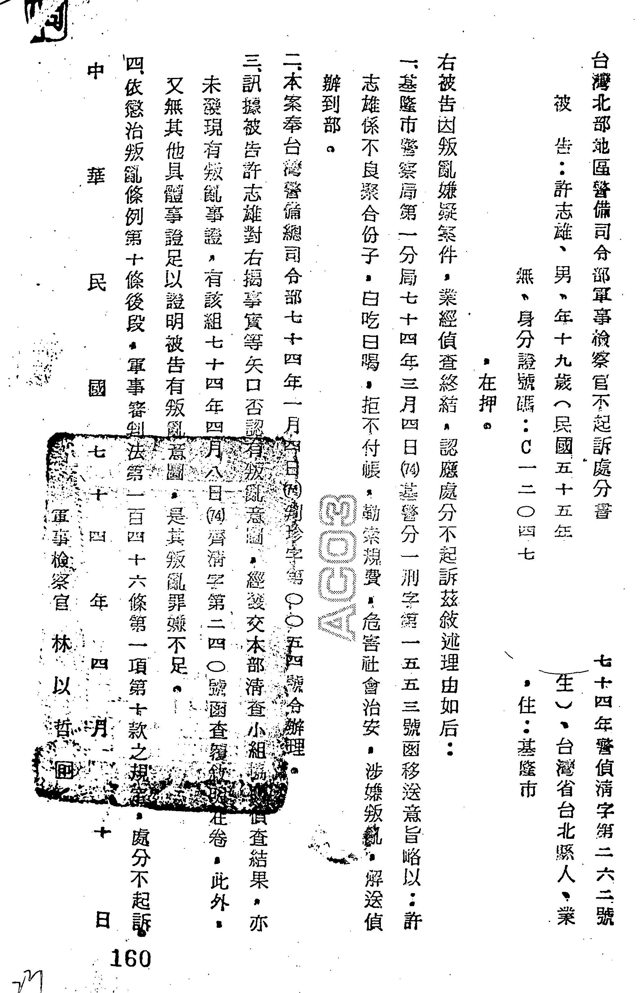 裁判書主文/要旨:許志雄因叛亂嫌疑案件業經偵查終結認應處分不起訴。