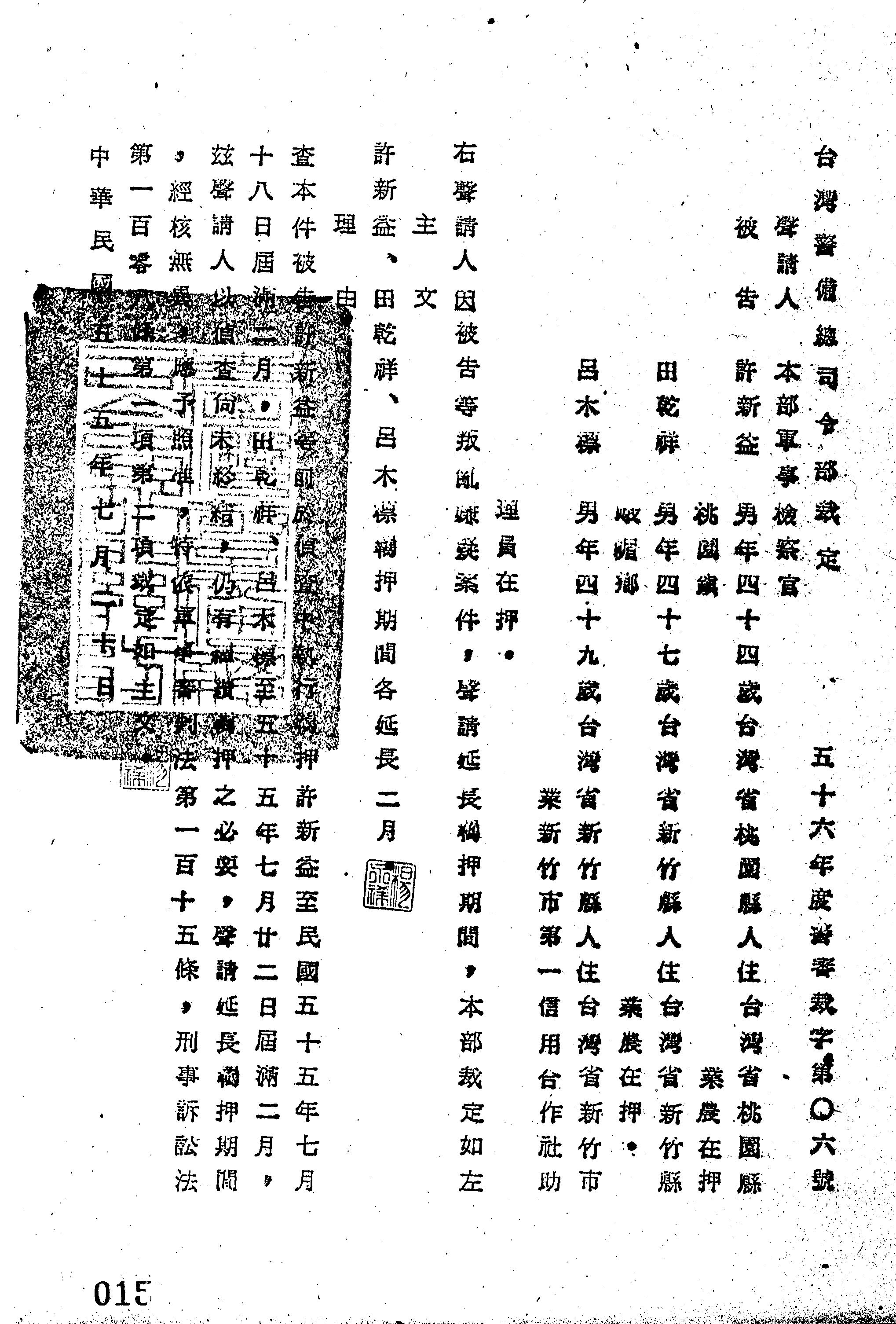 審理機關:臺灣警備總司令部