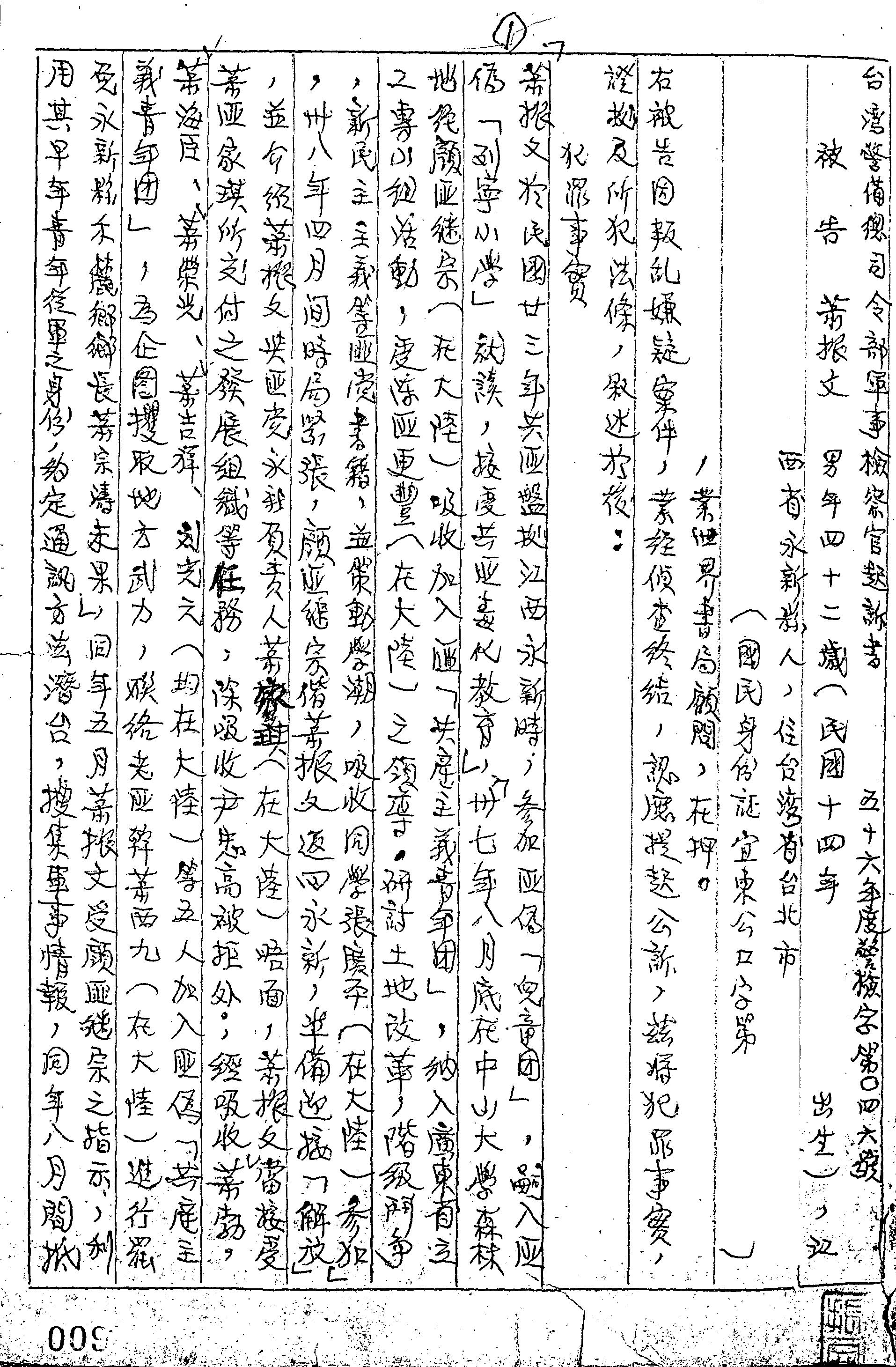 臺灣警備總司令部56年警檢字第0046號軍事檢察官起訴書