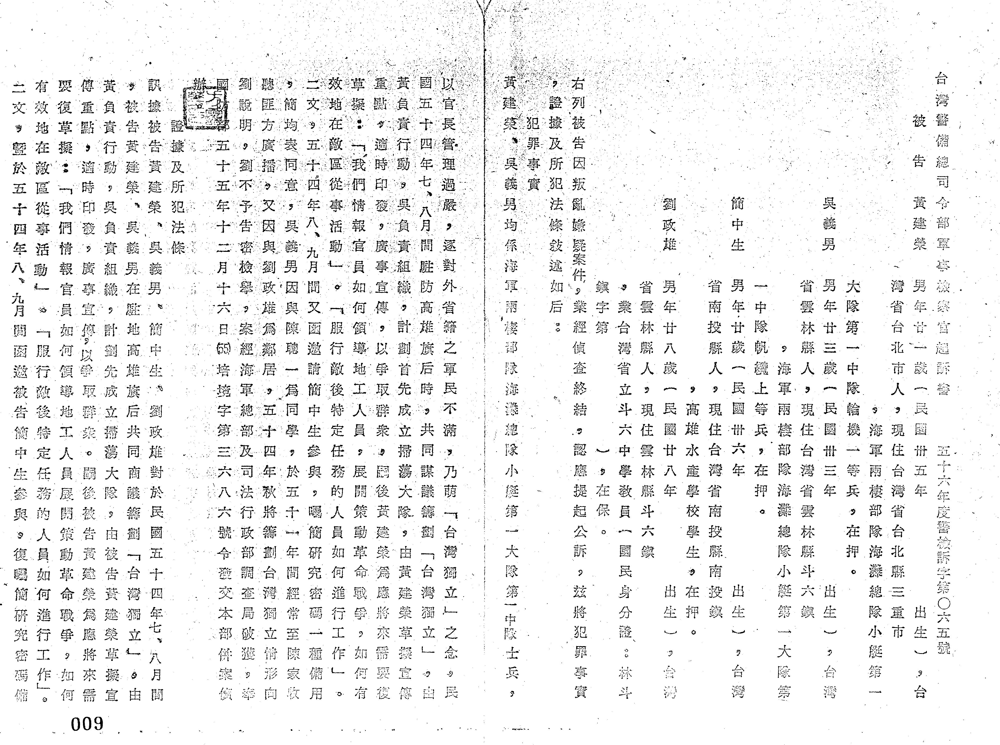 臺灣警備總司令部56年警檢訴字第0065號軍事檢察官起訴書