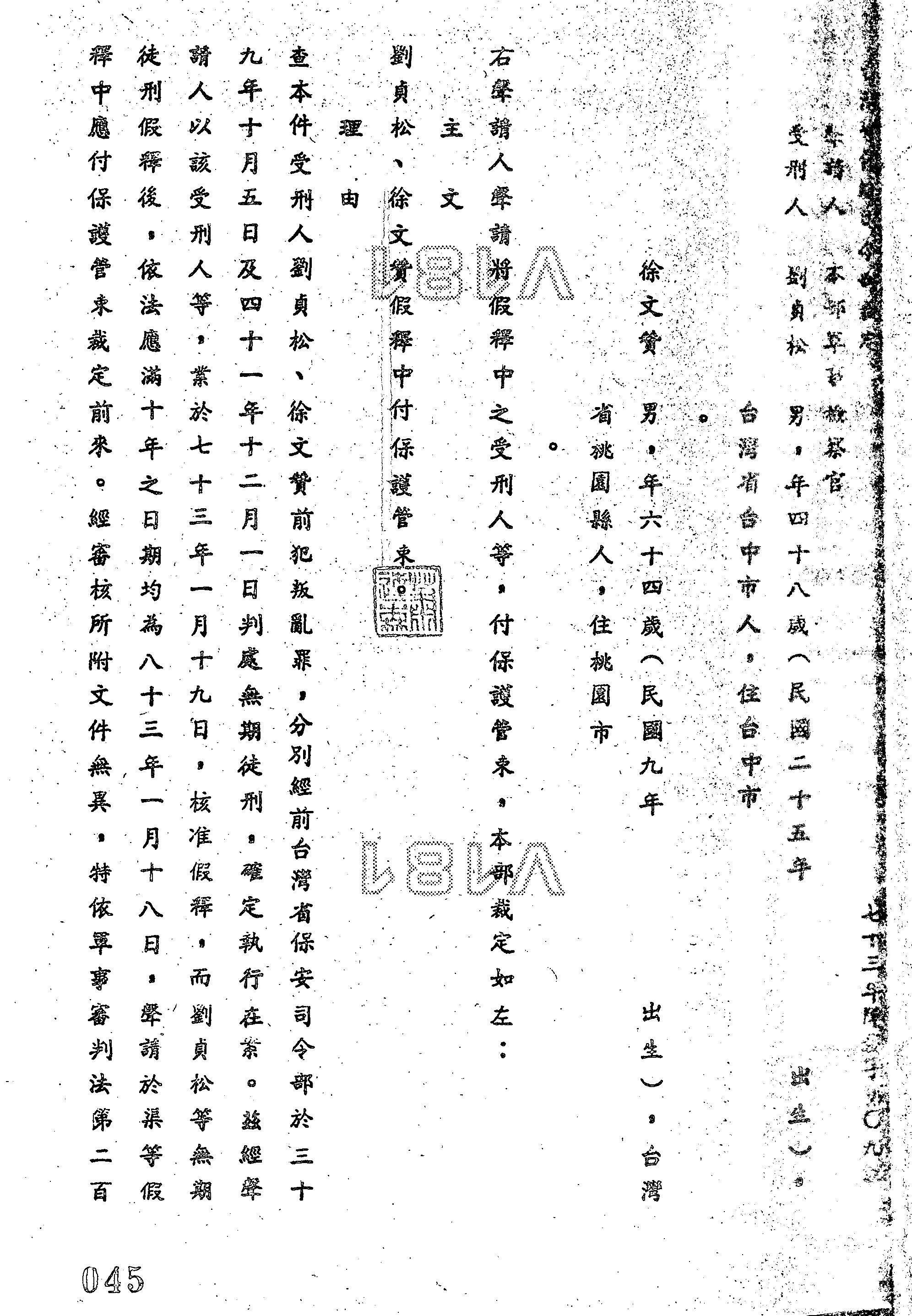裁判書主文/要旨:劉貞松、徐文贊假釋中付保護管束。