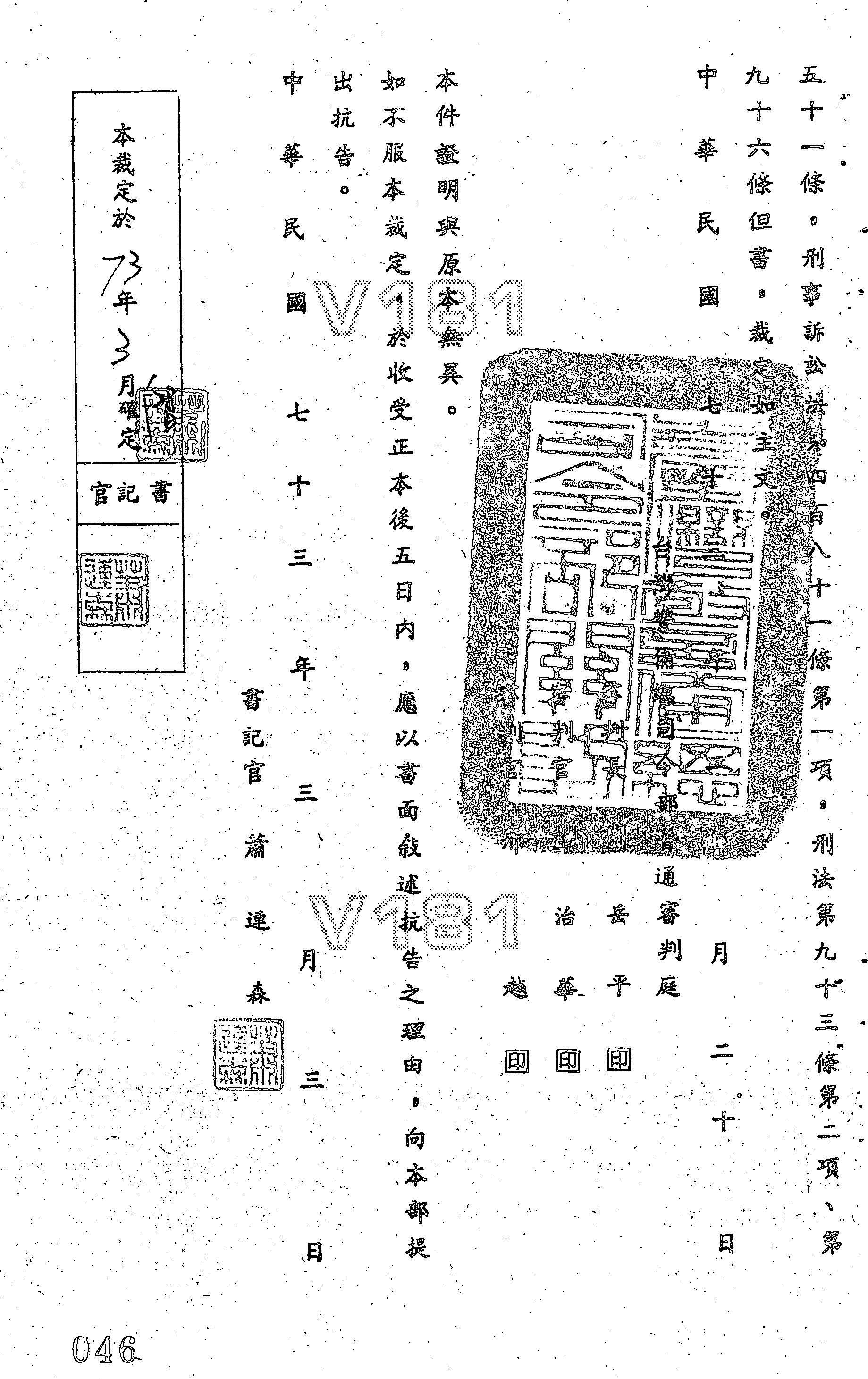 臺灣警備總司令部73年障裁字第0009號裁定書