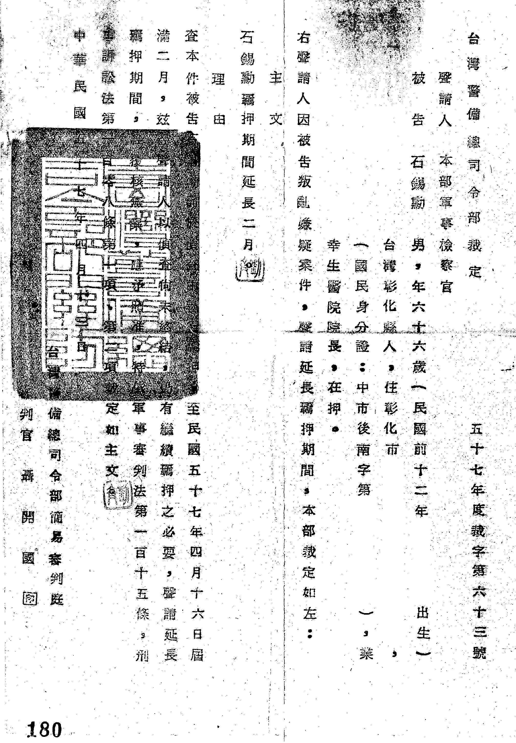 裁判書主文/要旨:石錫勳羈押期間延長2月。