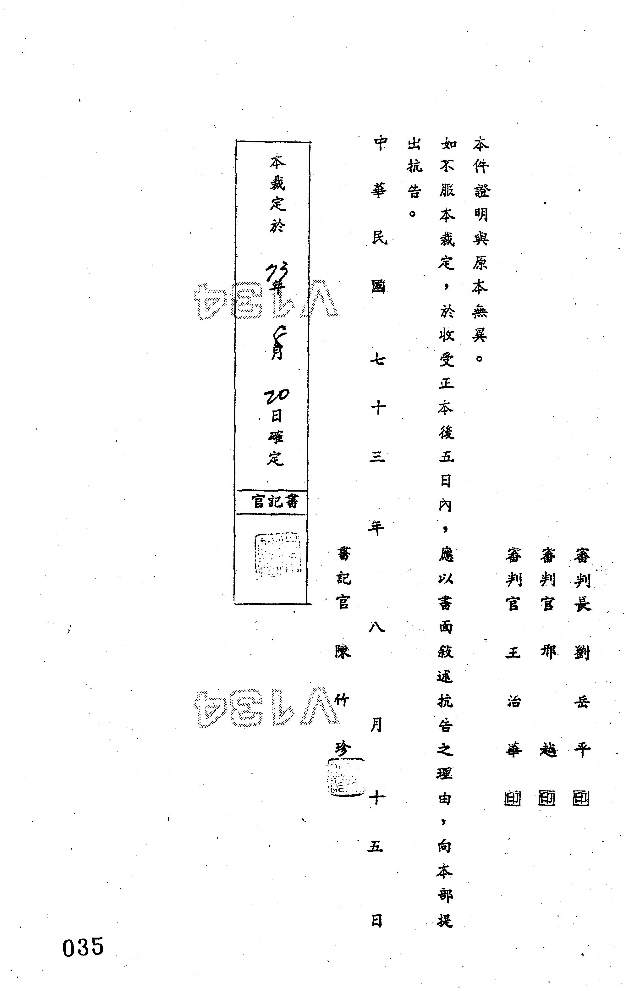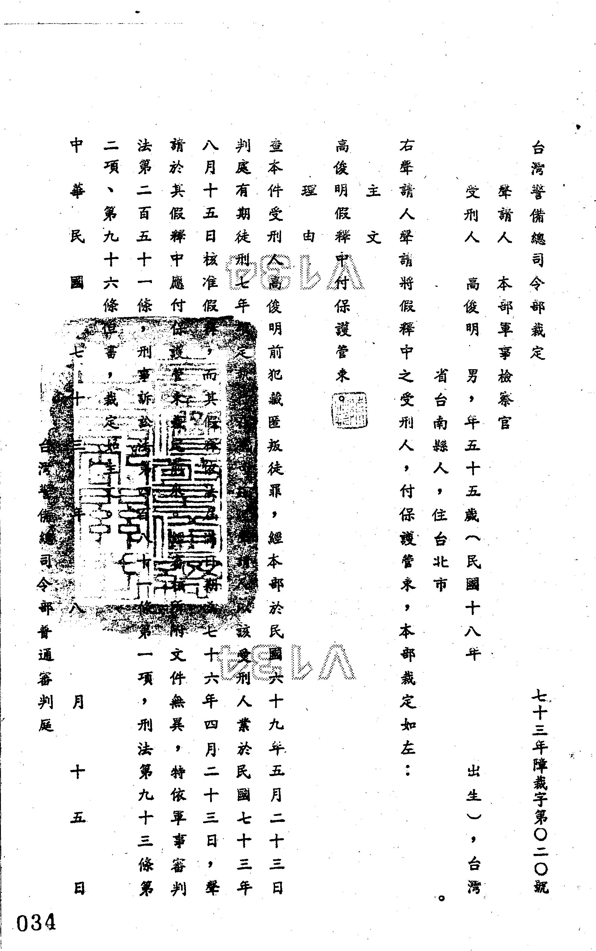 臺灣警備總司令部73年障裁字第0020號裁定書