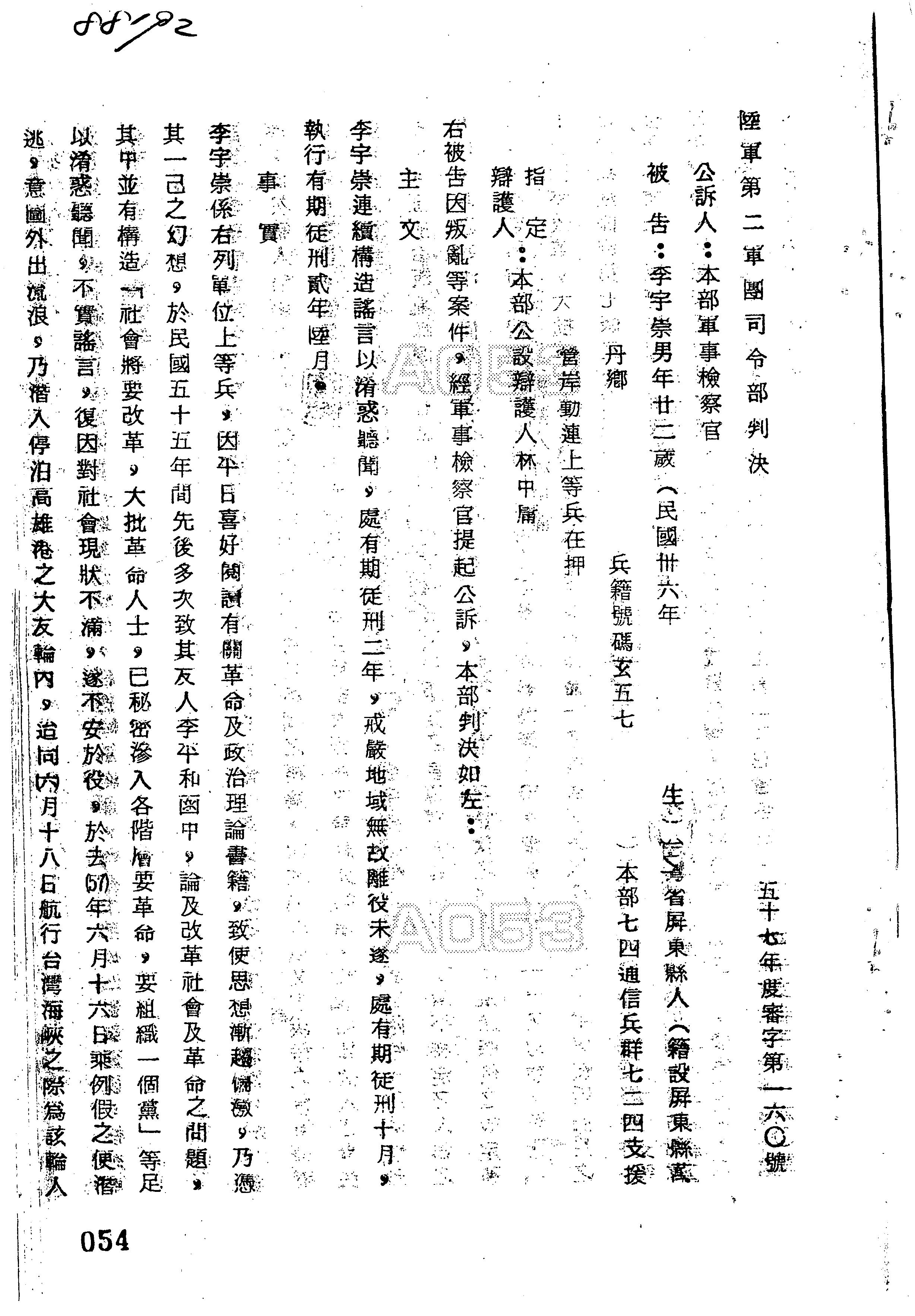 - 裁判書正題名: 陸軍第二軍團司令部57年審字第0160號判決書