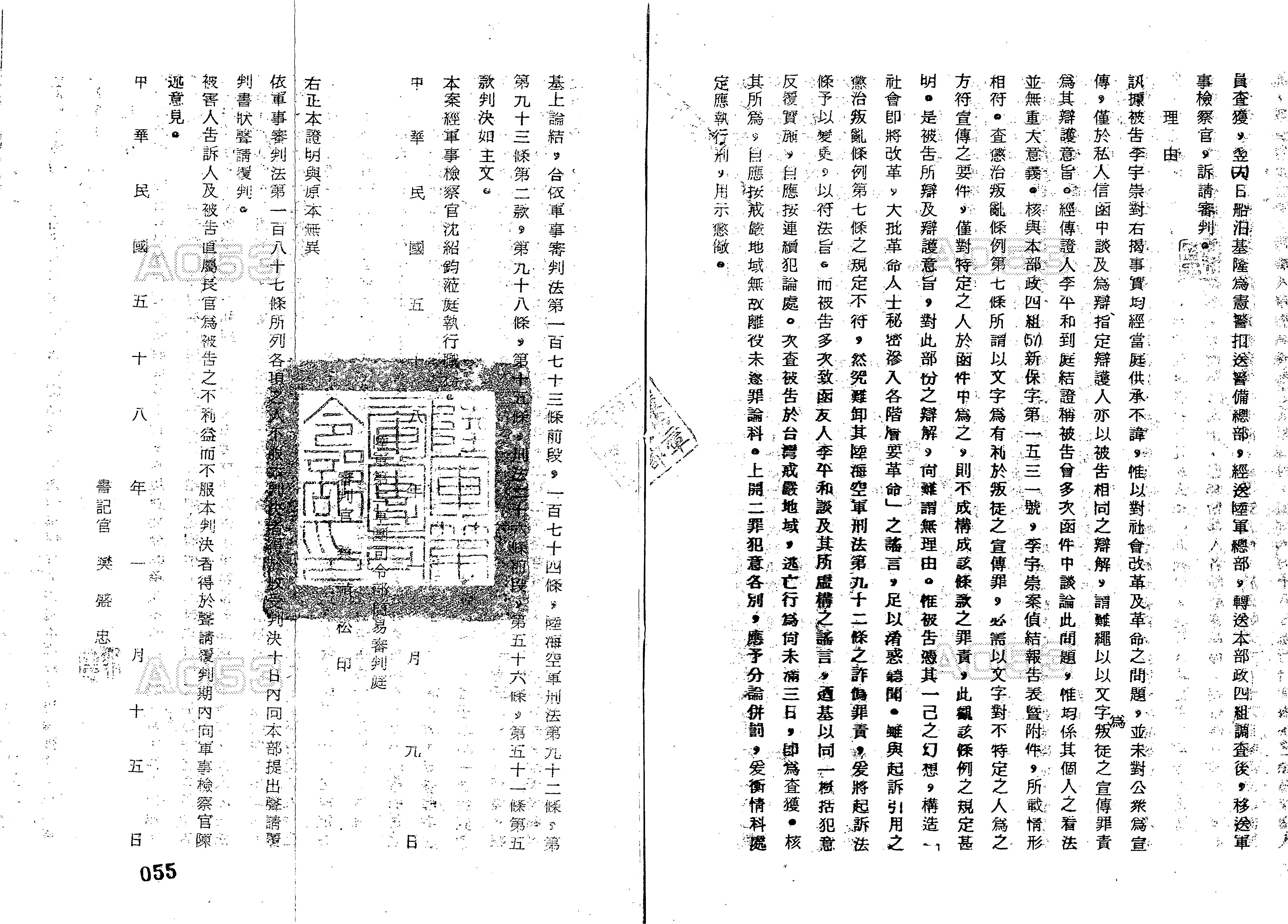 - 法條:軍事審判法第173條前段、第174條;陸海空軍刑法第92條、第93條第2款、第98條、第15條;戡亂時期貪汙治罪條例第5條第2款、第12條、第17條;刑法第26條前段、第56條、第51條第5款