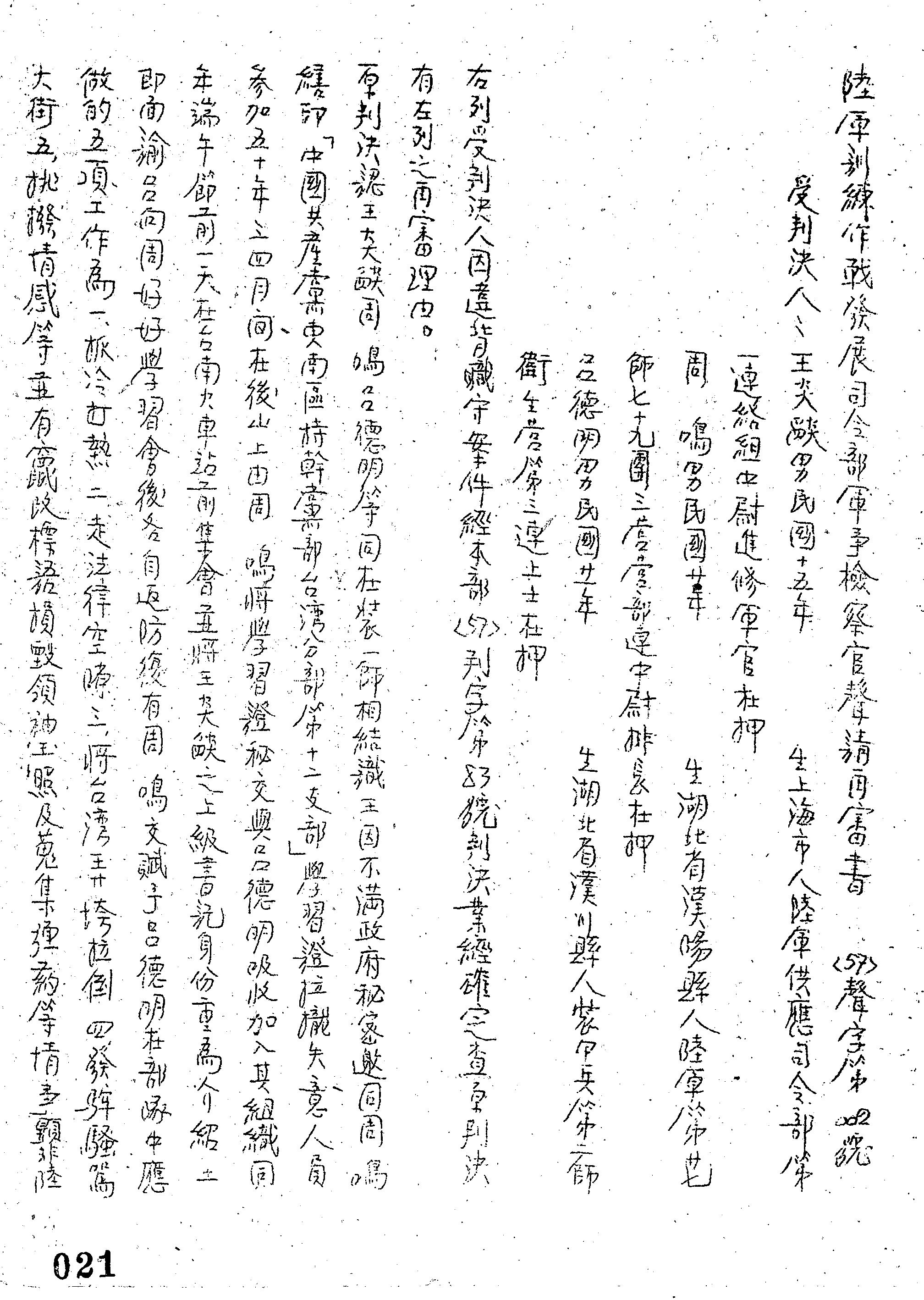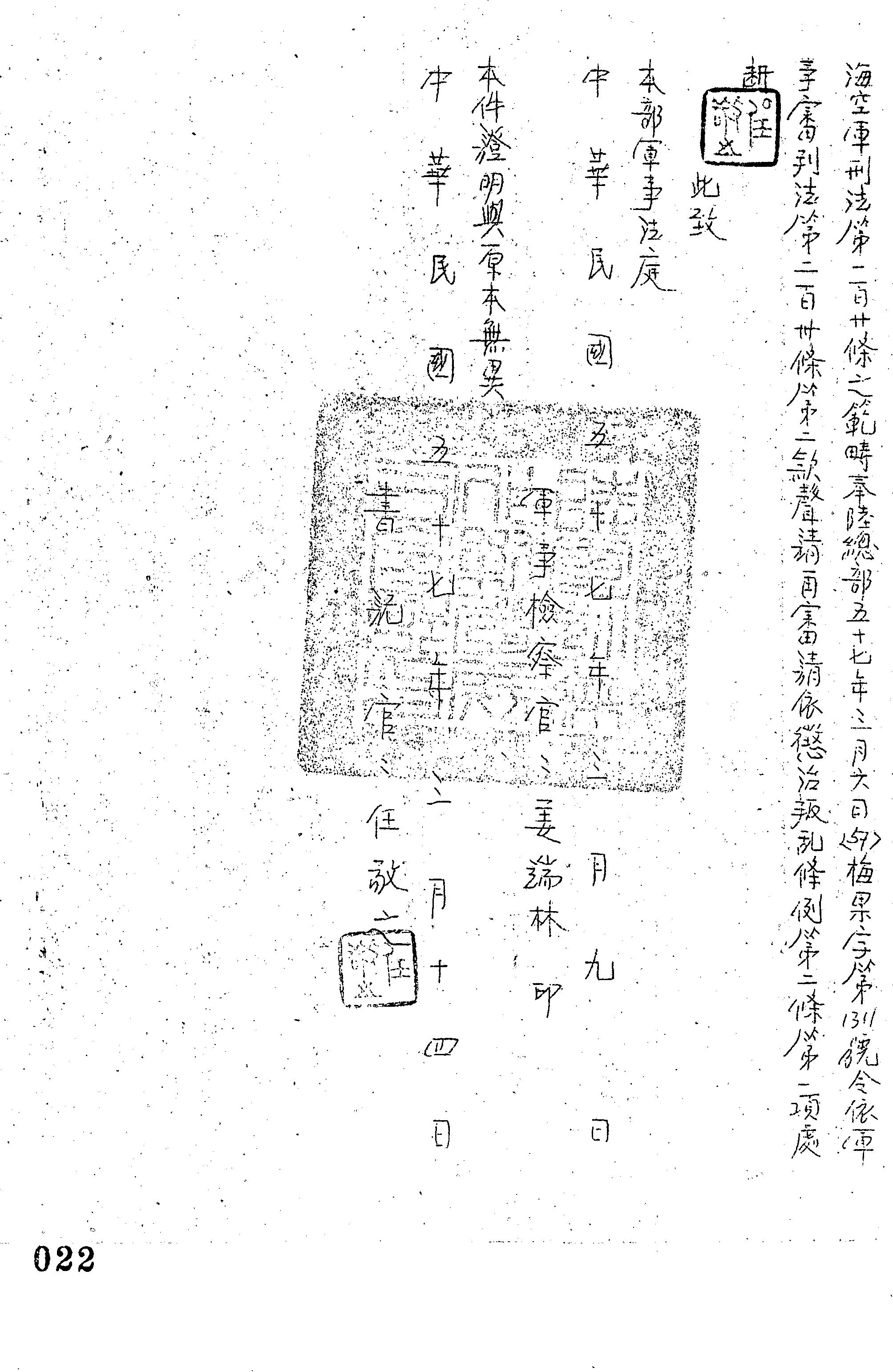 陸軍訓練作戰發展司令部57年聲字第0002號軍事檢察官聲請再審書