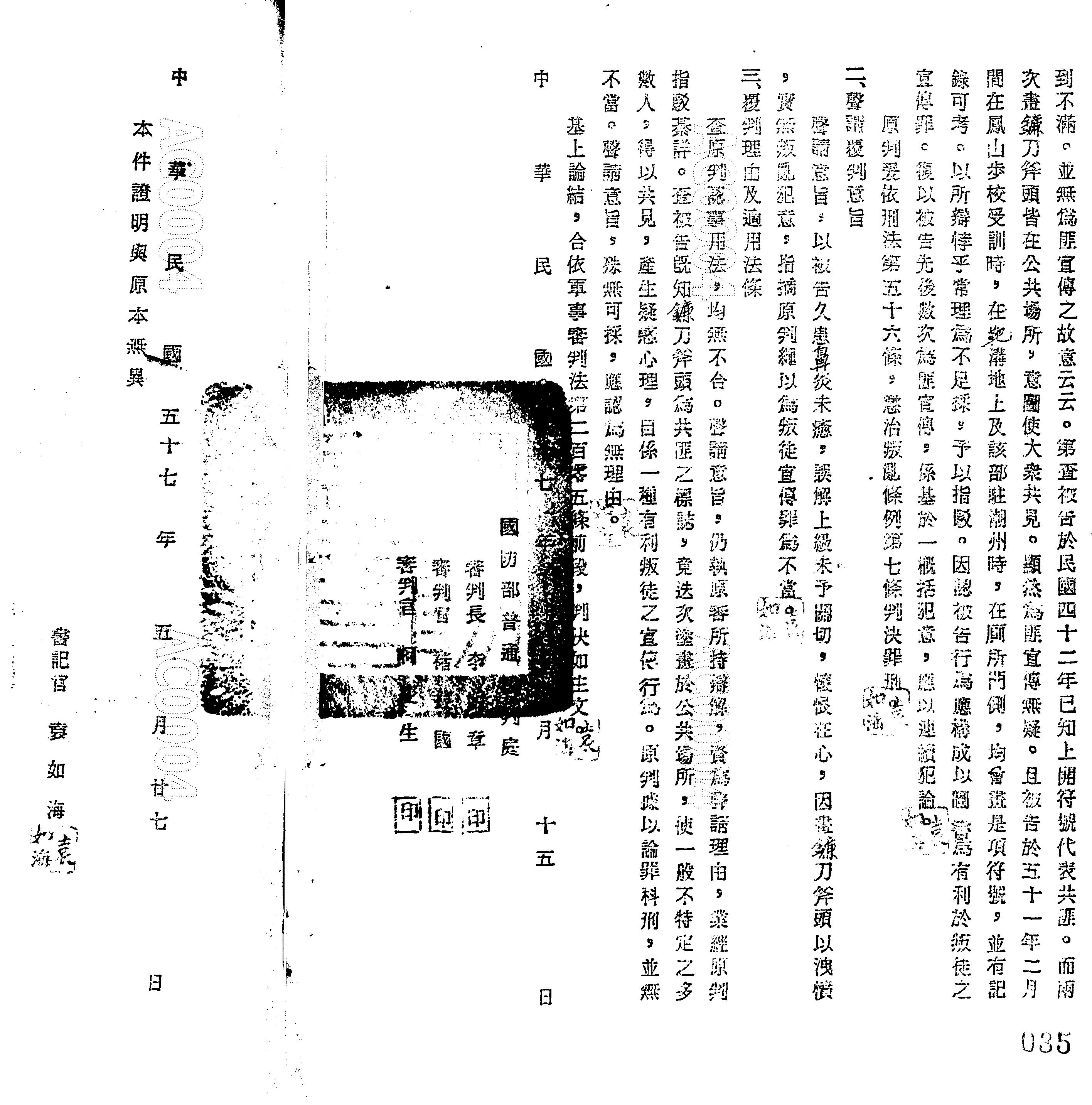裁判書字號:(57)覆普辨字第0035號