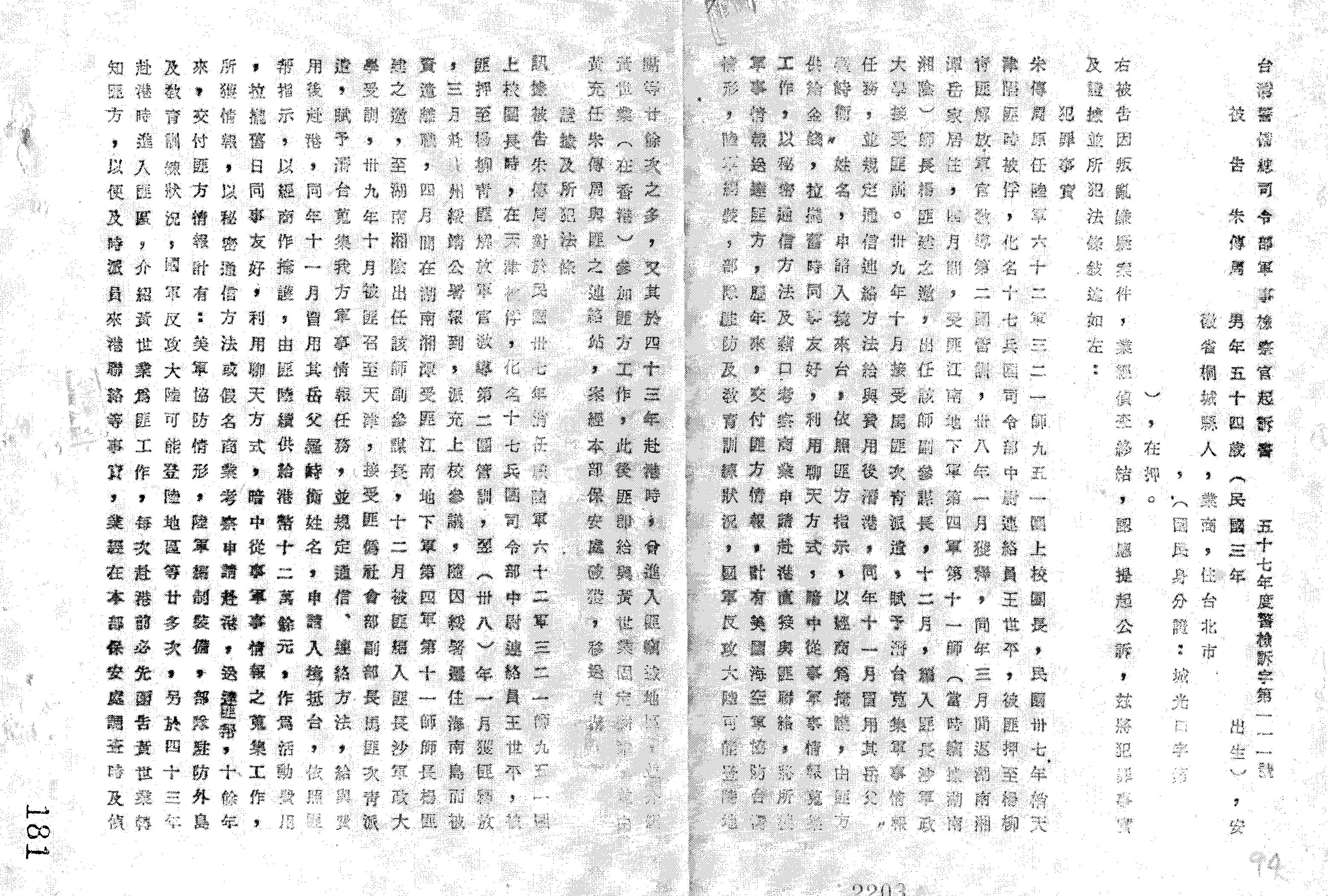 裁判書主文/要旨:朱傳周因叛亂嫌疑案件業經偵查終結認應提起公訴。
