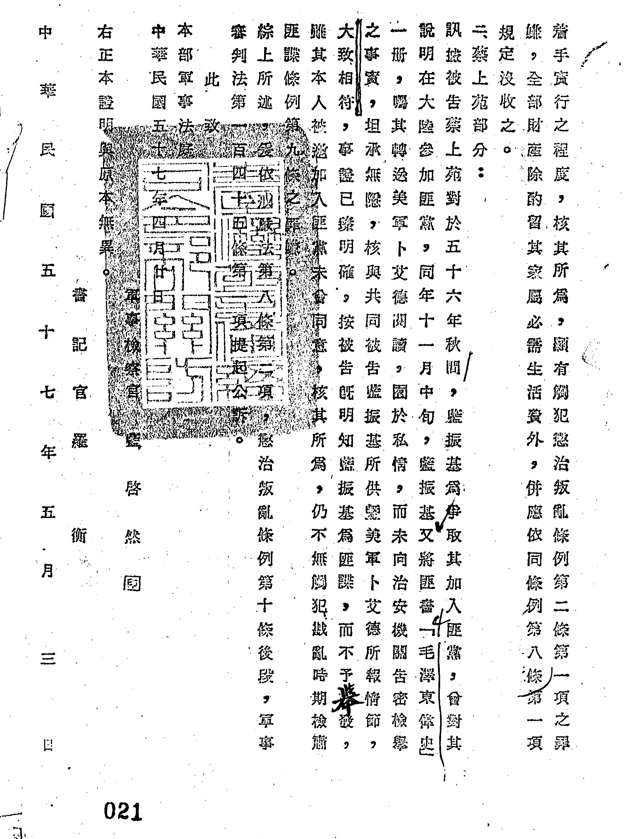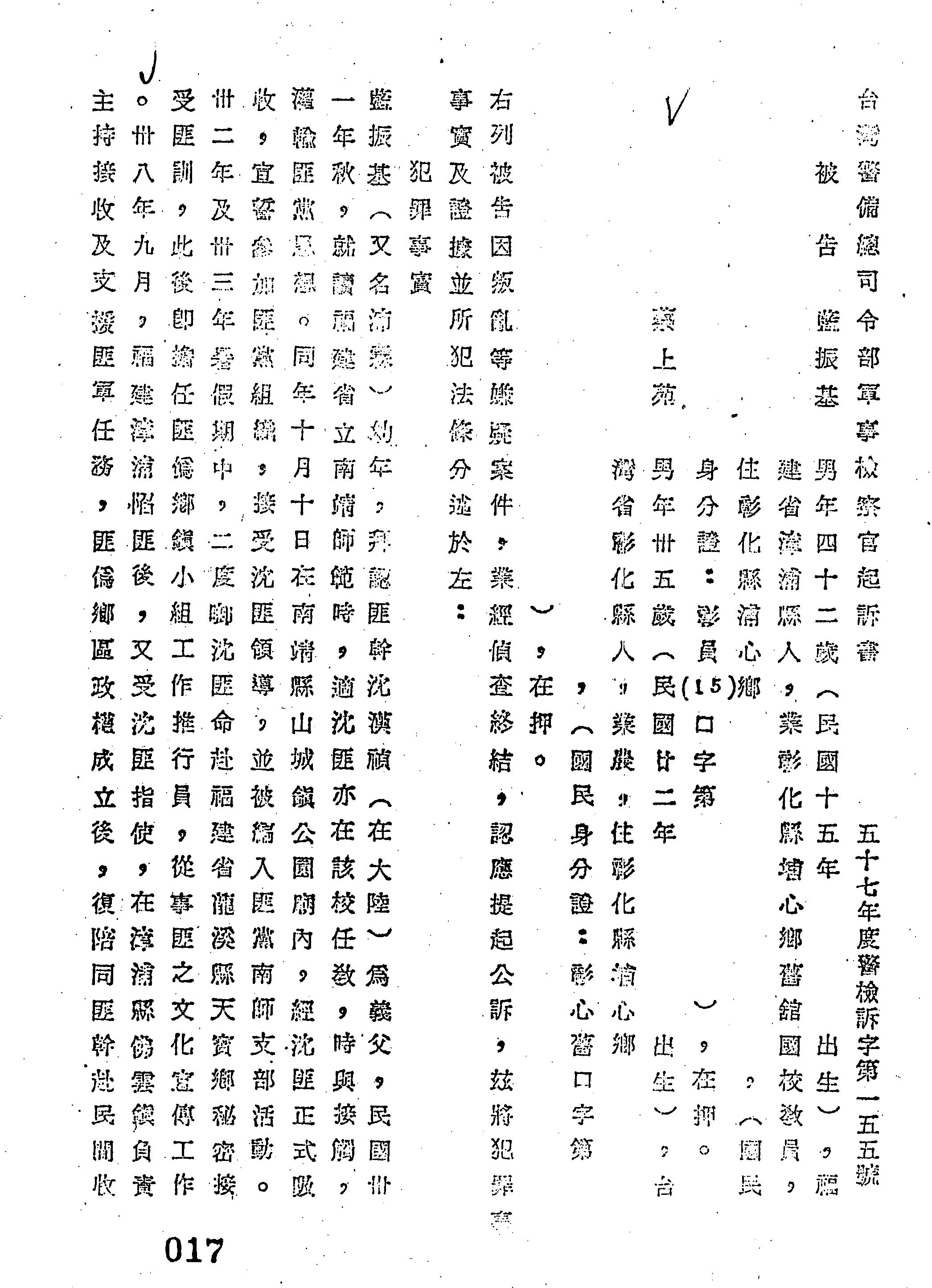 臺灣警備總司令部57年警檢訴字第0155號軍事檢察官起訴書