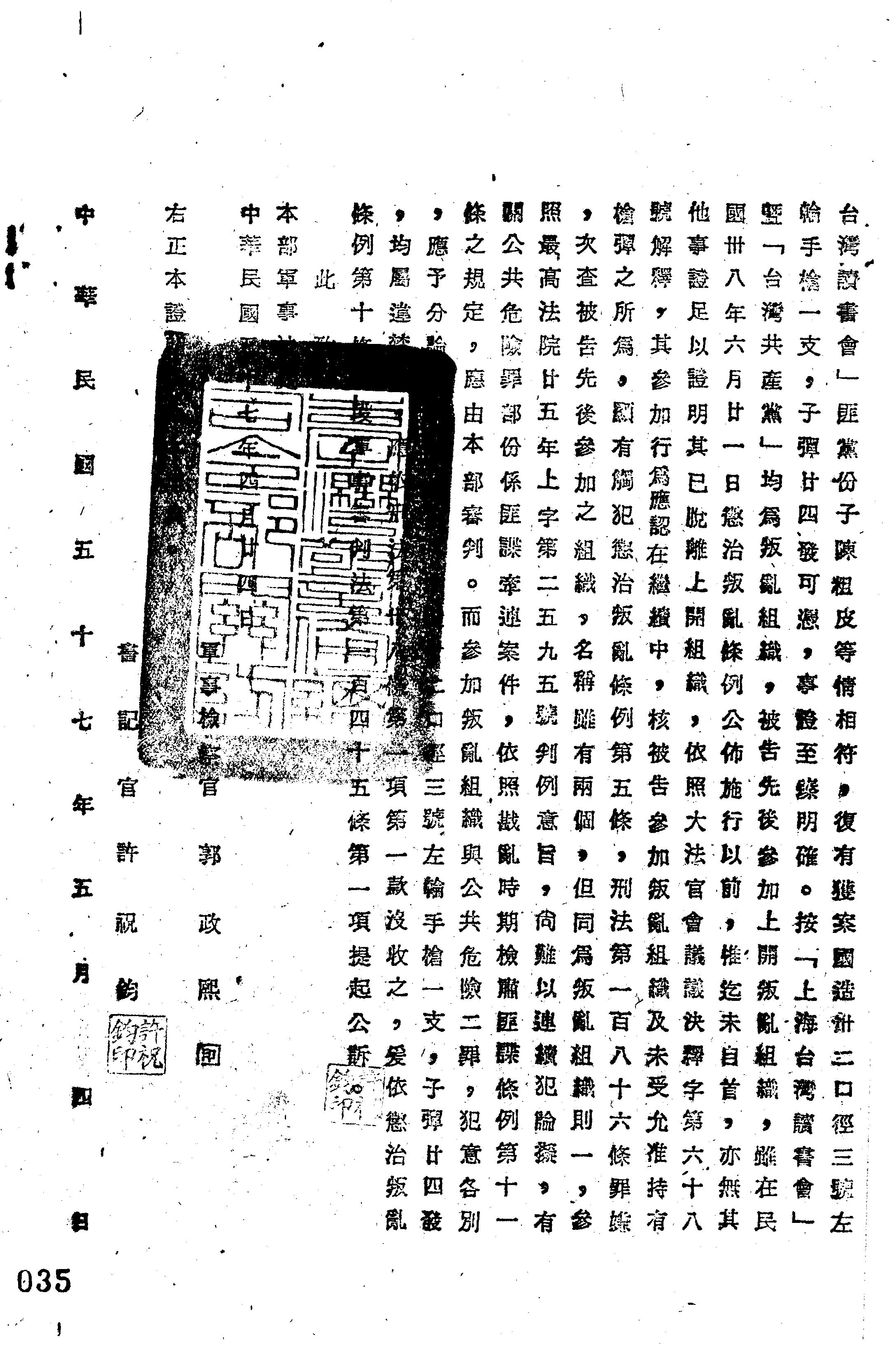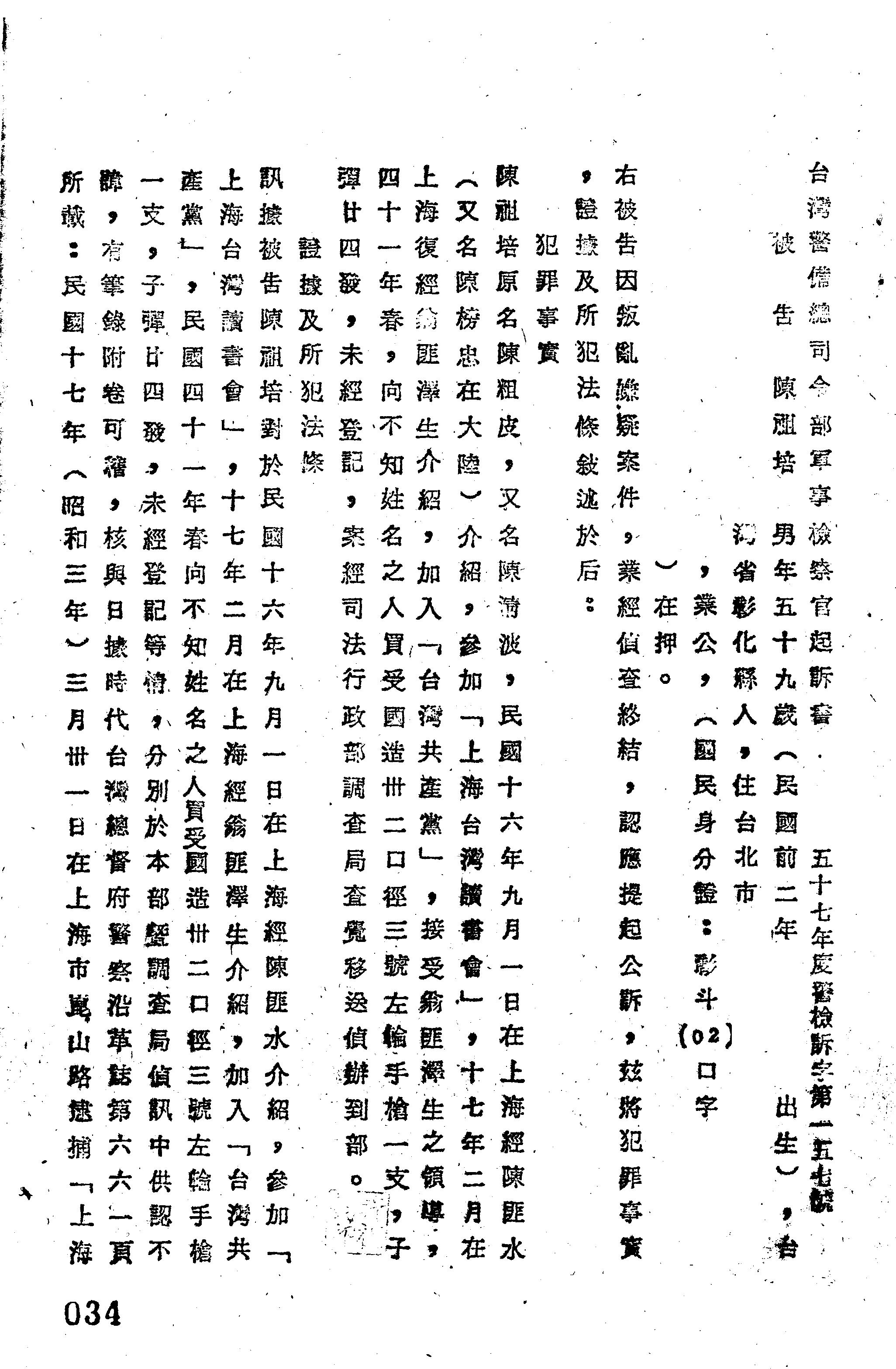 裁判書主文/要旨:陳祖培因叛亂嫌疑案件業經偵查終結認應提起公訴。