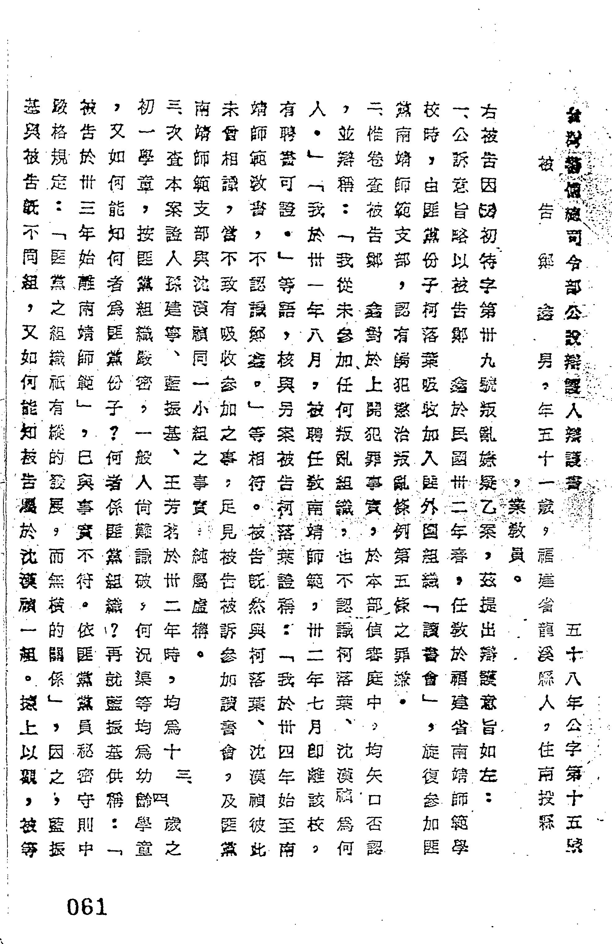 臺灣警備總司令部58年公字第0015號公設辯護人辯護書