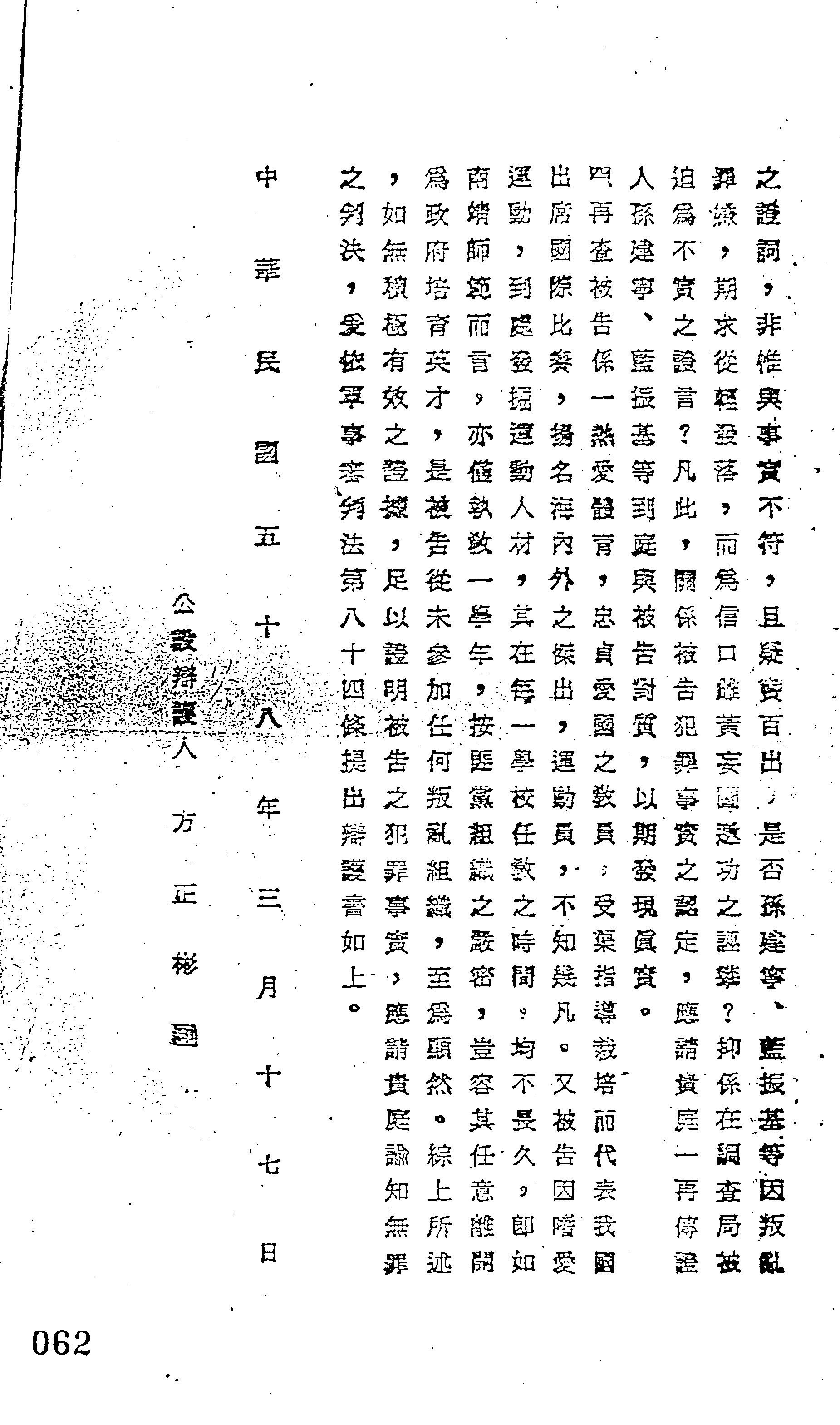 裁判書主文/要旨:就鄭鑫因(58)初特字第卅九號叛亂嫌疑乙案提出辯護。