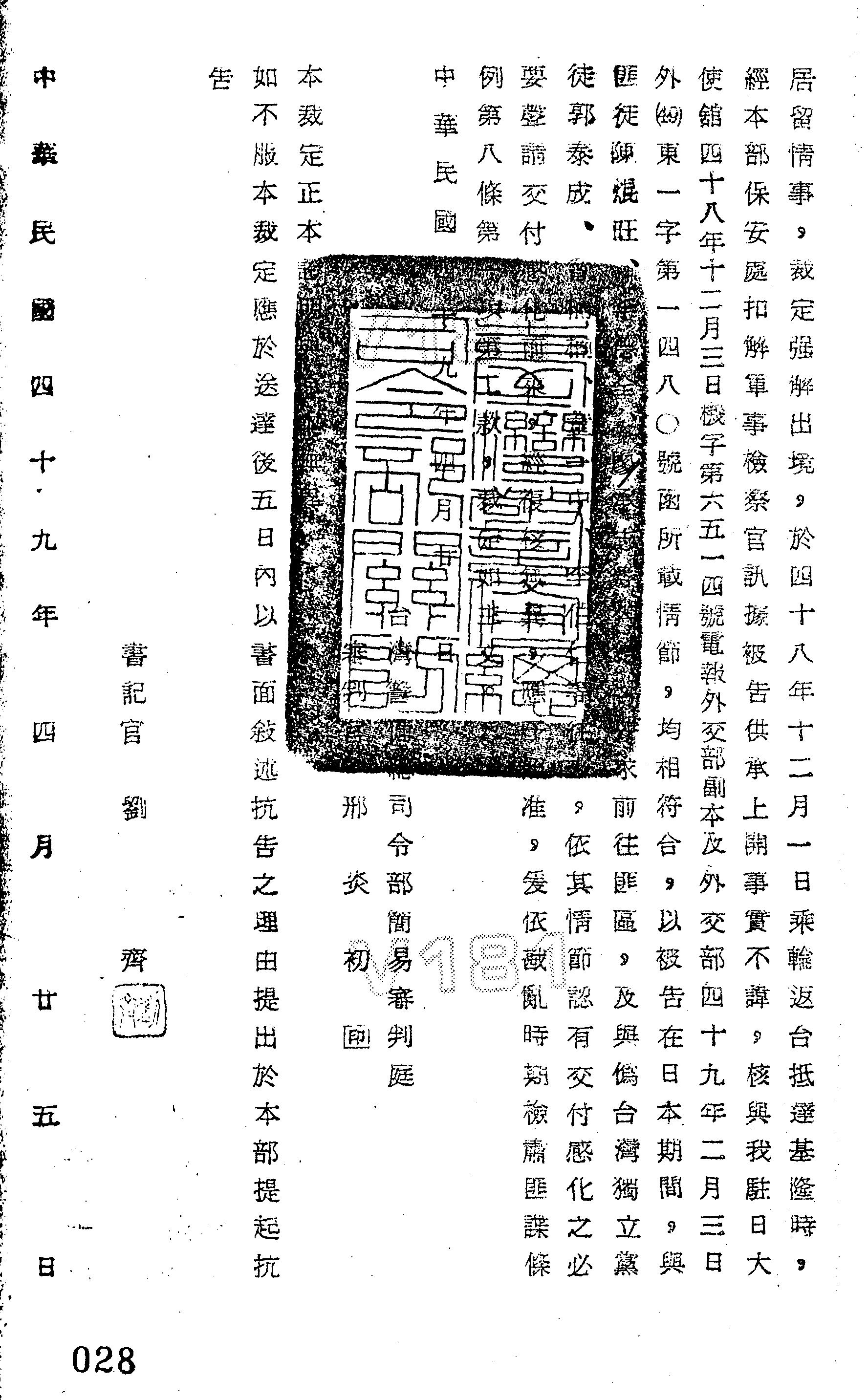 臺灣警備總司令部49年警審聲字第0010號裁定書