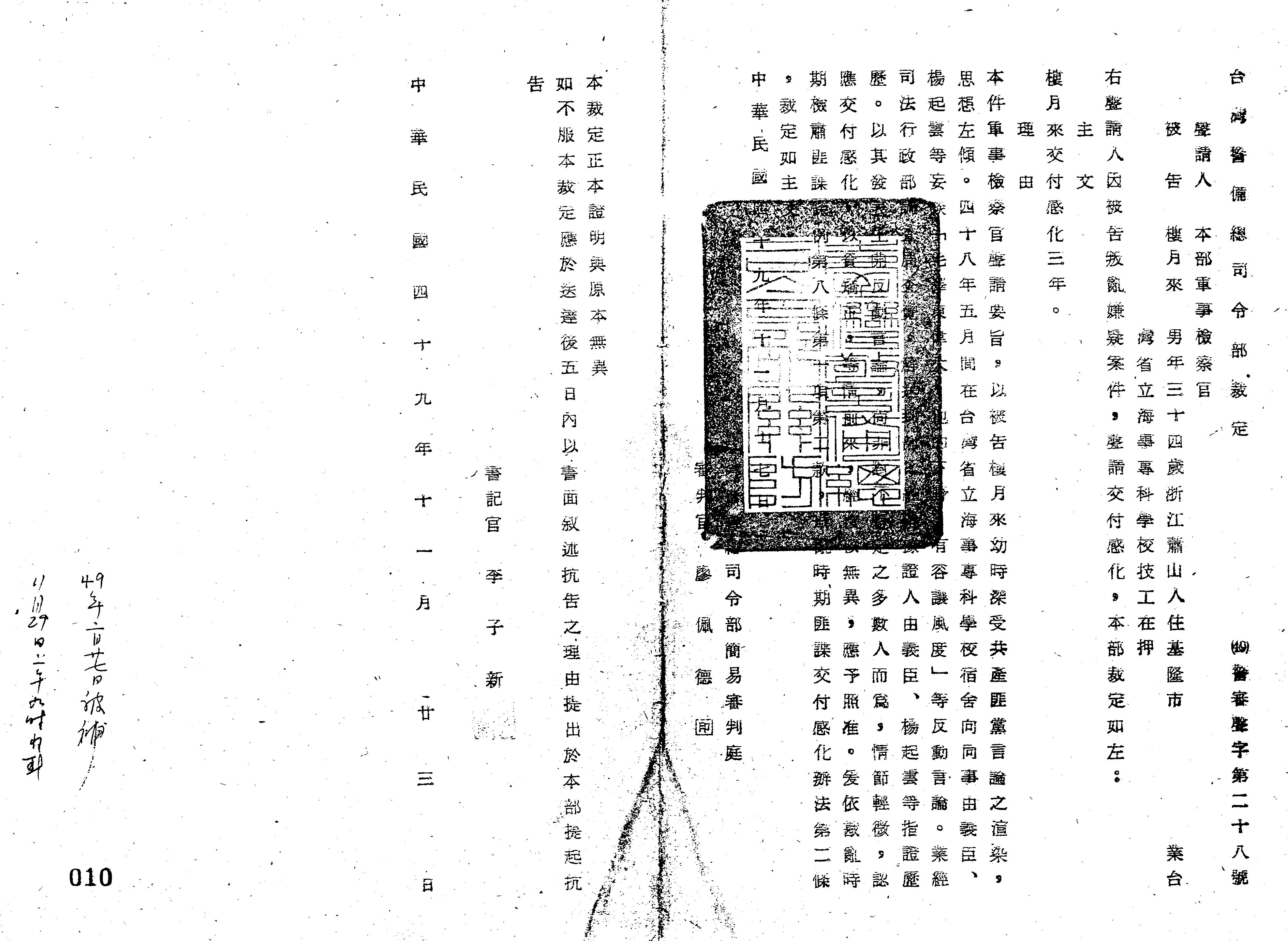 臺灣警備總司令部49年警審聲字第0028號裁定書