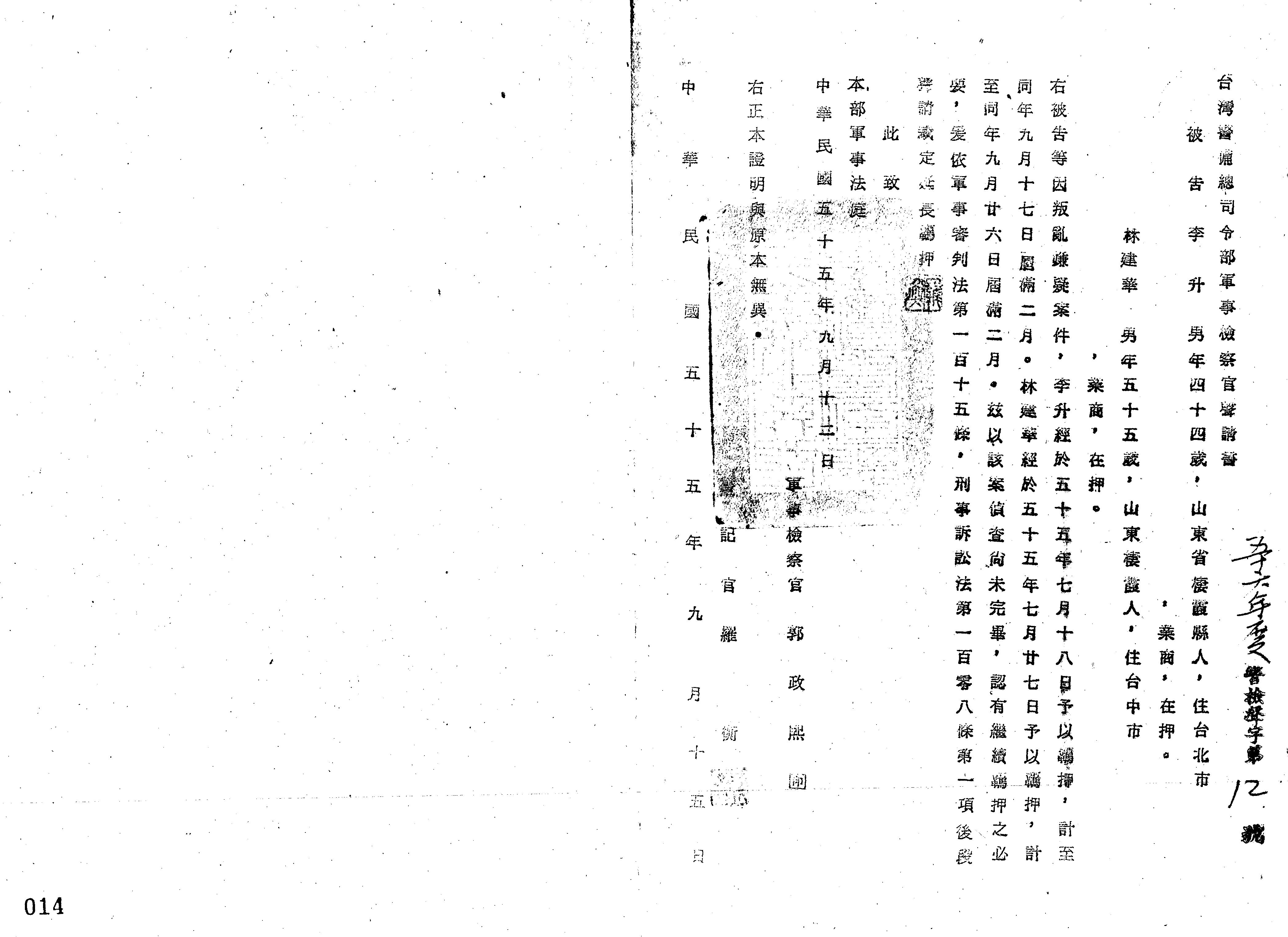 臺灣警備總司令部56年警檢聲字第0012號軍事檢察官聲請書