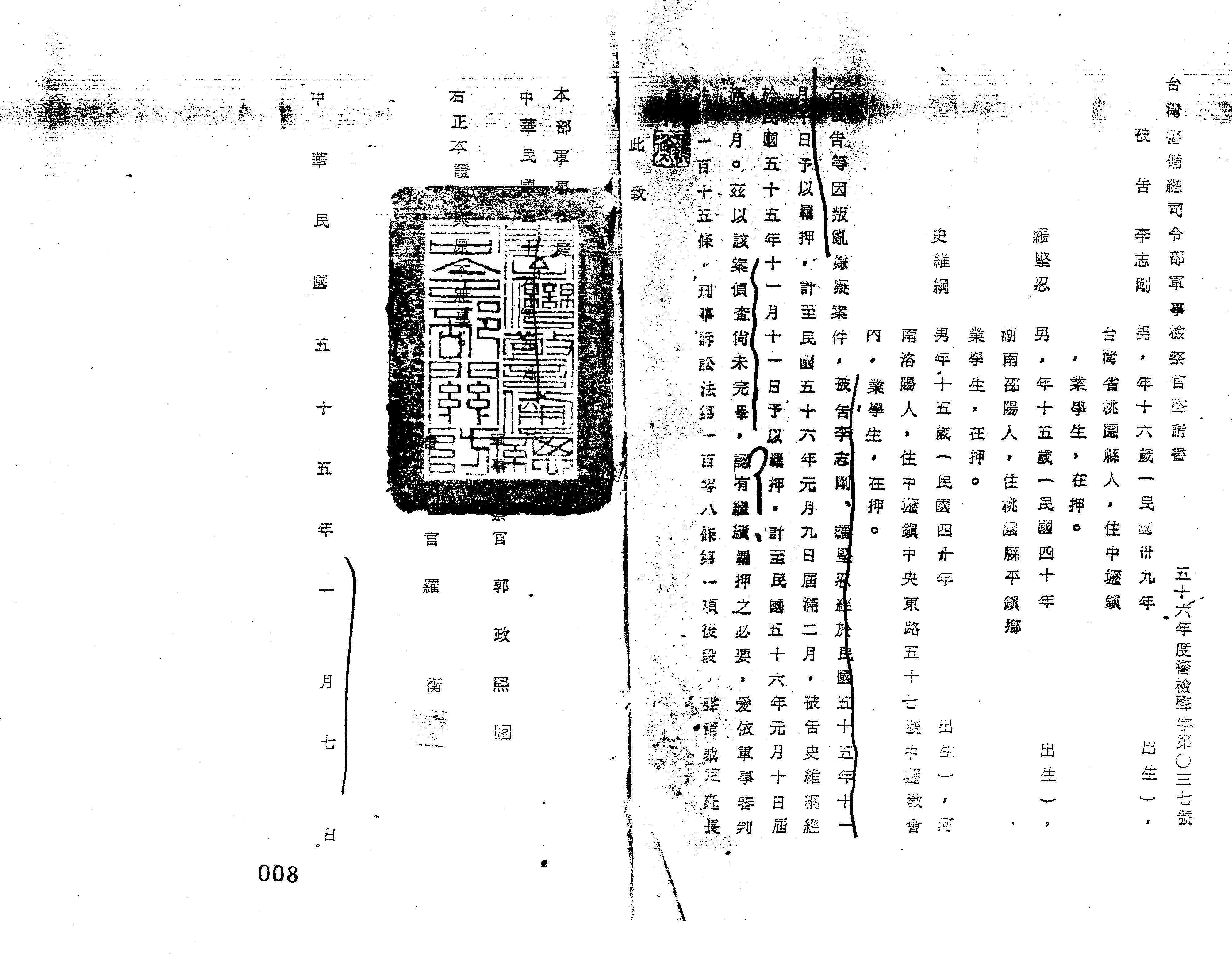臺灣警備總司令部56年警檢聲字第0037號軍事檢察官聲請書